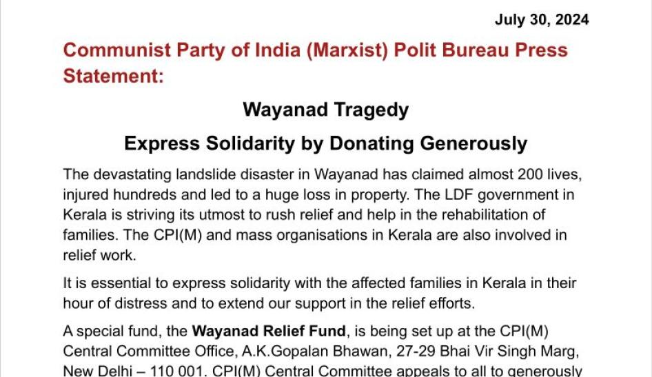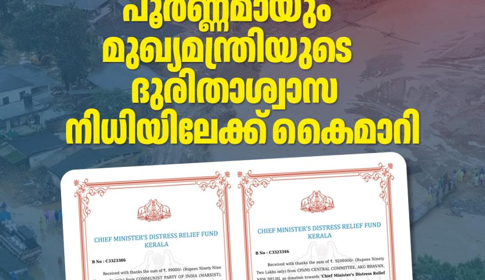 വയനാട് ഉരുൾപൊട്ടൽ ദുരന്തത്തിന്റെ പശ്ചാത്തലത്തിൽ സിപിഐ എം കേന്ദ്ര കമ്മിറ്റി രൂപീകരിച്ച പ്രത്യേക ഫണ്ടിലേക്ക് ലഭിച്ച തുക പൂർണ്ണമായും മുഖ്യമന്ത്രിയുടെ ദുരിതാശ്വാസ നിധിയിലേക്ക് കൈമാറിയിട്ടുണ്ട്. ഇക്കാര്യത്തിൽ കണക്കുകൾ സുതാര്യമാണ്.
