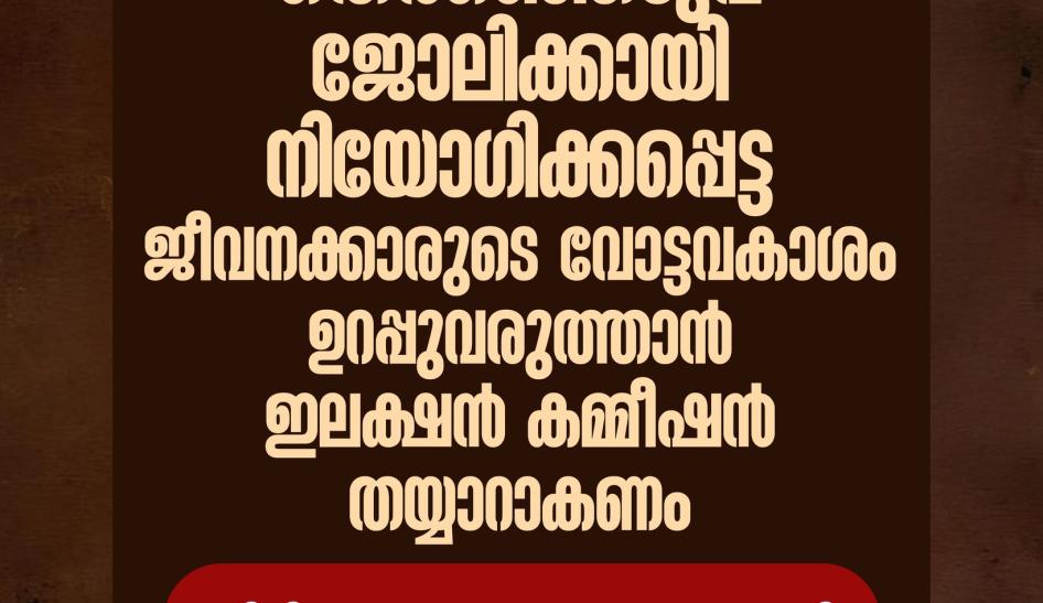 തെരഞ്ഞെടുപ്പ് ജോലിക്ക് നിയോഗിക്കപ്പെട്ട ഉദ്യോഗസ്ഥര്ക്ക് വോട്ടവകാശം വിനിയോഗിക്കാനുള്ള സൗകര്യം അടിയന്തരമായി ഉറപ്പുവരുത്തണം. തപാല് വോട്ടിന് തെരഞ്ഞെടുപ്പ് കമീഷന് ഏര്പ്പെടുത്തിയ പുതിയ ക്രമീകരണങ്ങള് വ്യാപക ആശയക്കുഴപ്പത്തിന് ഇടയാക്കുകയാണ്.