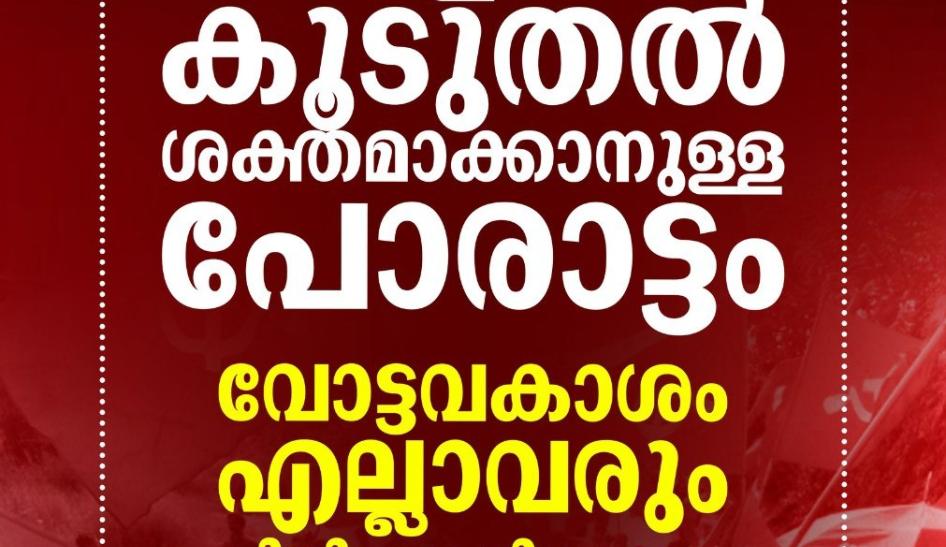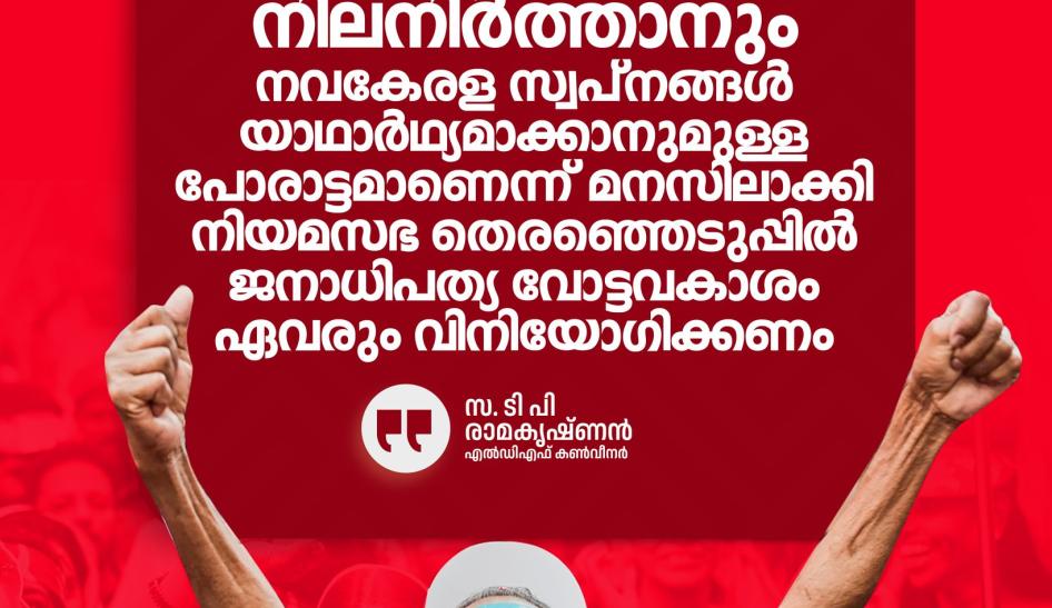 ഇന്നത്തെ കേരളം കൂടുതല് ശക്തമായി നിലനിര്ത്തിക്കൊണ്ടുപോകാനും നവകേരള സ്വപ്നങ്ങള് യാഥാര്ഥ്യമാക്കാനുമുള്ള പോരാട്ടമാണെന്ന് മനസിലാക്കി നിയമസഭ തെരഞ്ഞെടുപ്പില് ജനാധിപത്യ വോട്ടവകാശം ഏവരും വിനിയോഗിക്കണം.