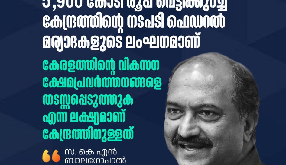 നടപ്പു സാമ്പത്തിക വർഷത്തിലെ അവസാന പാദത്തിൽ സംസ്ഥാനത്തിന് അനുവദനീയമായ കടമെടുപ്പ് പരിധിയിൽ നിന്ന് 5,900 കോടി രൂപ വെട്ടിക്കുറച്ച കേന്ദ്രത്തിന്റെ നടപടി ഫെഡറൽ മര്യാദകളുടെ ലംഘനമാണ്. യാതൊരുവിധത്തിലും ഇത് നീതീകരിക്കാൻ കഴിയില്ല. മലയാളികളോടുള്ള കേന്ദ്രസർക്കാരിന്റെ യുദ്ധപ്രഖ്യാപനമാണിത്.