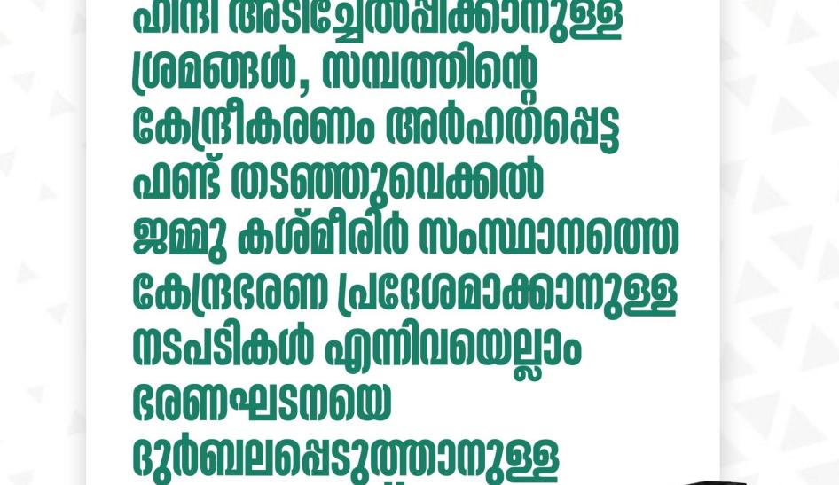 ഹിന്ദി അടിച്ചേൽപ്പിക്കാനുള്ള ശ്രമങ്ങൾ, സമ്പത്തിന്റെ കേന്ദ്രീകരണം, അർഹതപ്പെട്ട ഫണ്ട് തടഞ്ഞുവെക്കൽ, ജമ്മു കശ്മീർ സംസ്ഥാനത്തെ കേന്ദ്രഭരണ പ്രദേശമാക്കാനുള്ള നടപടികൾ എന്നിവയെല്ലാം ഭരണഘടനയെ ദുർബലപ്പെടുത്താനുള്ള ശ്രമങ്ങളാണ്