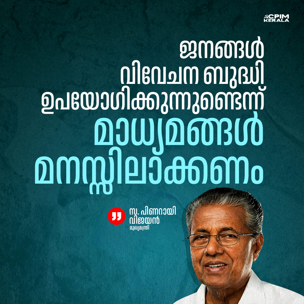 ജനങ്ങൾ വിവേചന ബുദ്ധി ഉപയോഗിക്കുന്നുണ്ടെന്ന് മാധ്യമങ്ങൾ മനസ്സിലാക്കണം. മാധ്യങ്ങൾ ഉദ്ദേശിക്കുന്ന തരത്തിലല്ല ജനങ്ങൾ കാര്യങ്ങളെ കാണുന്നത്. എന്തെല്ലാം എഴുതിയിട്ടും ഉപതിരഞ്ഞെടുപ്പിലെ മുന്നേറ്റം കണ്ടല്ലോ? ജില്ലകളിൽ നടക്കുന്ന മുഖാമുഖം പരിപാടിയിൽ വലിയ ജനപങ്കാളിത്തമാണ് കണ്ടുവരുന്നത്. പരിപാടിയിൽ ആളെക്കൂട്ടാനല്ല, കൂടിയ ആളെ ഉൾക്കൊള്ളാനാണ് പാടുപെടുന്നത്. യുവാക്കളോടും വിവിധ തുറകളിലുള്ളവരോടും മുഖ്യമന്ത്രി നേരിട്ട് സംസാരിക്കുന്നു എന്ന വേറിട്ട ആശയം ജനങ്ങൾ ഒരേമനസോടെ ഏറ്റെടുത്തിരിക്കുന്ന സാഹചര്യത്തിലാണ് ചില മാധ്യമങ്ങൾ വ്യാജവാർത്ത നൽകുന്നത്.
