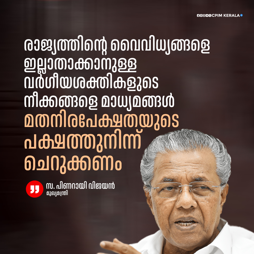 രാജ്യത്തിന്റെ വൈവിധ്യങ്ങളെ ഇല്ലാതാക്കാനുള്ള വർഗീയശക്തികളുടെ നീക്കങ്ങളെ മാധ്യമങ്ങൾ മതനിരപേക്ഷതയുടെ പക്ഷത്തുനിന്ന് ചെറുക്കണം. മാധ്യമങ്ങളുടെ നിലനിൽപ്പിനും അത് അത്യന്താപേക്ഷിതമാണ്. വർഗീയതയും മതനിരപേക്ഷതയും ഏറ്റുമുട്ടുന്നിടത്ത് നിഷ്പക്ഷതയെന്നാൽ കാപട്യവും വർഗീയതയുടെ പക്ഷം ചേരലുമാണ്.