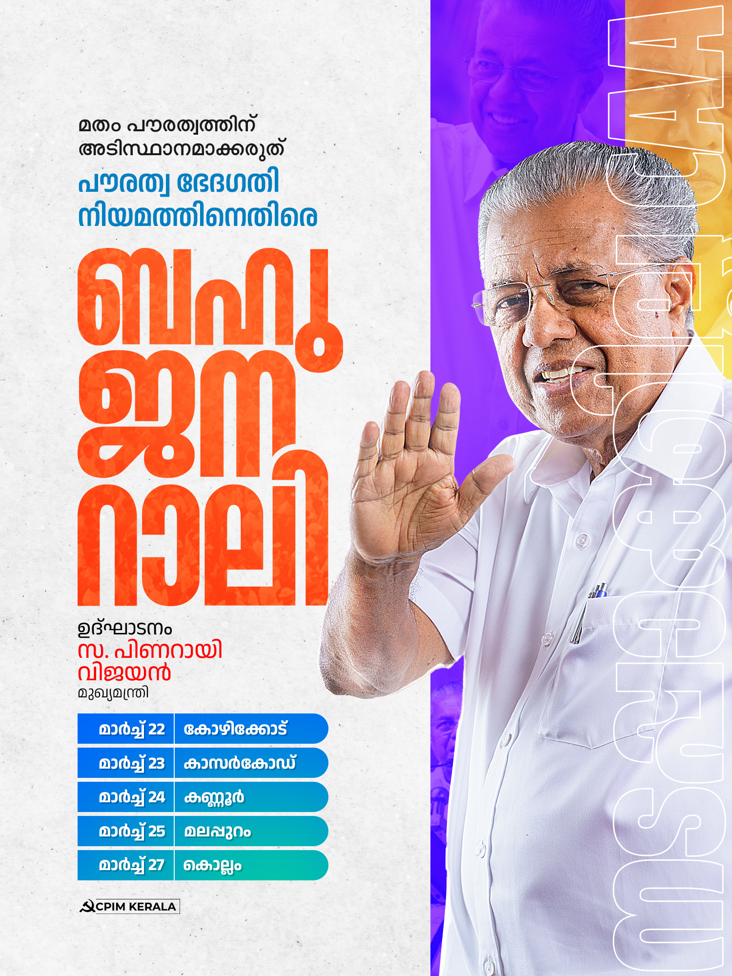 പൗരത്വം ലഭിക്കുന്നതിനായി മതത്തെ അടിസ്ഥാനമാക്കുന്ന പൗരത്വ ഭേദഗതി നിയമം കേരളത്തില് നടപ്പാക്കില്ലെന്ന് പ്രഖ്യാപിച്ച് സിപിഐ എം സംഘടിപ്പിക്കുന്ന ബഹുജന റാലികൾ മാർച്ച് 22ന് ആരംഭിക്കും. കോഴിക്കോട് കടപ്പുറത്തെ ഫ്രീഡം സ്ക്വയറിൽ നടക്കുന്ന ആദ്യ റാലിയിൽ ഒരു ലക്ഷം പേർ പങ്കെടുക്കും. മാർച്ച് 22 വൈകുന്നേരം 7.00 മണിക്ക് മുഖ്യമന്ത്രി സ. പിണറായി വിജയൻ പരിപാടി ഉദ്ഘാടനം ചെയ്യും. മാർച്ച് 23 ന് കാസർകോട്ടും 24 ന് കണ്ണൂരിലും 25 ന് മലപ്പുറത്തും 27 ന് കൊല്ലത്തും റാലികൾ സംഘടിപ്പിക്കും. സാമൂഹ്യ, രാഷ്ട്രീയ, സാംസ്കാരിക രംഗത്തെ പ്രമുഖർ ബഹുജന റാലിയിൽ അണിനിരക്കും.