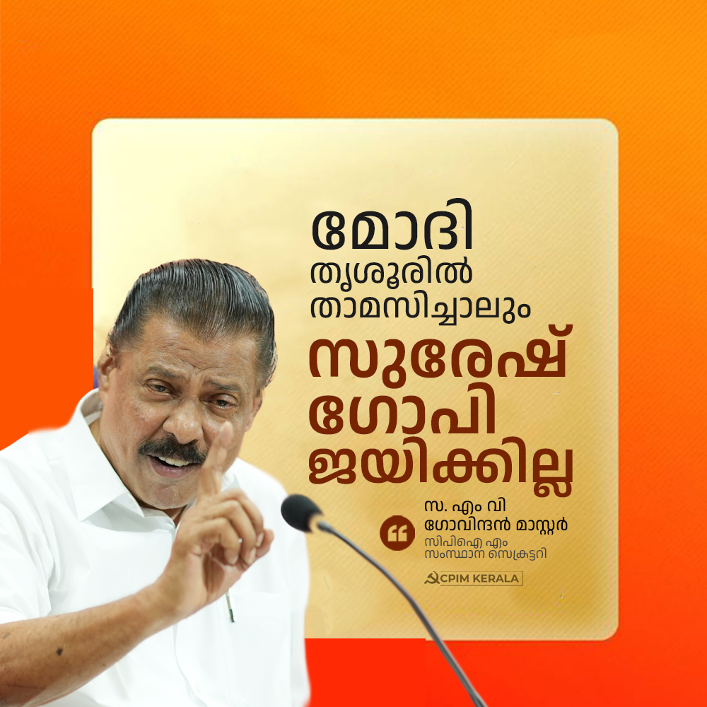 പ്രധാനമന്ത്രി നരേന്ദ്രമോദി തൃശൂരിൽ താമസിച്ചാലും ബിജെപി സ്ഥാനാർഥി സുരേഷ് ഗോപി ജയിക്കാൻ പോകുന്നില്ല. സുരേഷ് ഗോപി മൽസരിക്കാൻ എത്തിയപ്പോഴേ തോറ്റു. സ്വർണമെന്ന് പറഞ്ഞ് ചെമ്പ് കിരീടം നൽകി ദൈവത്തേയും പറ്റിച്ചയാളാണ് സുരേഷ് ഗോപി. കരുവന്നൂരിന്റെ പേര് പറഞ്ഞാണ് മോദി തൃശൂരിൽ എത്തുന്നത്. അതുകൊണ്ടൊന്നും കേരളത്തിലെ ലക്ഷ്യം പൂർത്തിയാക്കാൻ കഴിയില്ല. തൃശൂരിൽ കരുവന്നൂർ പ്രശ്നം ഉയർത്തിയിട്ട് ഒരുകാര്യവുമില്ല. അവിടത്തെ പ്രശ്നങ്ങൾ പരിഹരിച്ചു. ഇപ്പോൾ പ്രവർത്തനം സാധാരണ നിലയിലായി. അതിന്റെ പേരിലാണ് ഇന്ത്യയാകെ പ്രചാരണം നടത്തുന്നത്. ഇഡിക്ക് ഒപ്പം ഇപ്പോൾ ഇൻകം ടാകസും വന്നു. അവരുടെ കയ്യിൽ മോദിയുടെ വാളാണ്.
