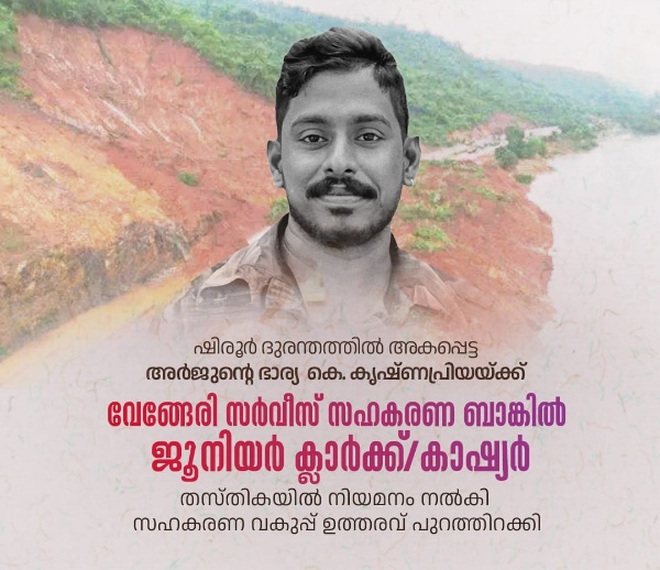 അർജുനന്റെ ഭാര്യ കെ. കൃഷ്ണപ്രിയയ്ക്ക് വേങ്ങേരി സർവീസ് സഹകരണ ബാങ്കിൽ ജൂനിയർ ക്ലാർക്ക്/കാഷ്യർ തസ്തികയിലാണ് നിയമനം നൽകുന്നത്. ഇതു സംബന്ധിച്ച ഉത്തരവ് (ജി.ഒ നമ്പർ 169/2024 സഹകരണം 29-8-2024) സഹകരണ വകുപ്പ് പുറത്തിറക്കി.