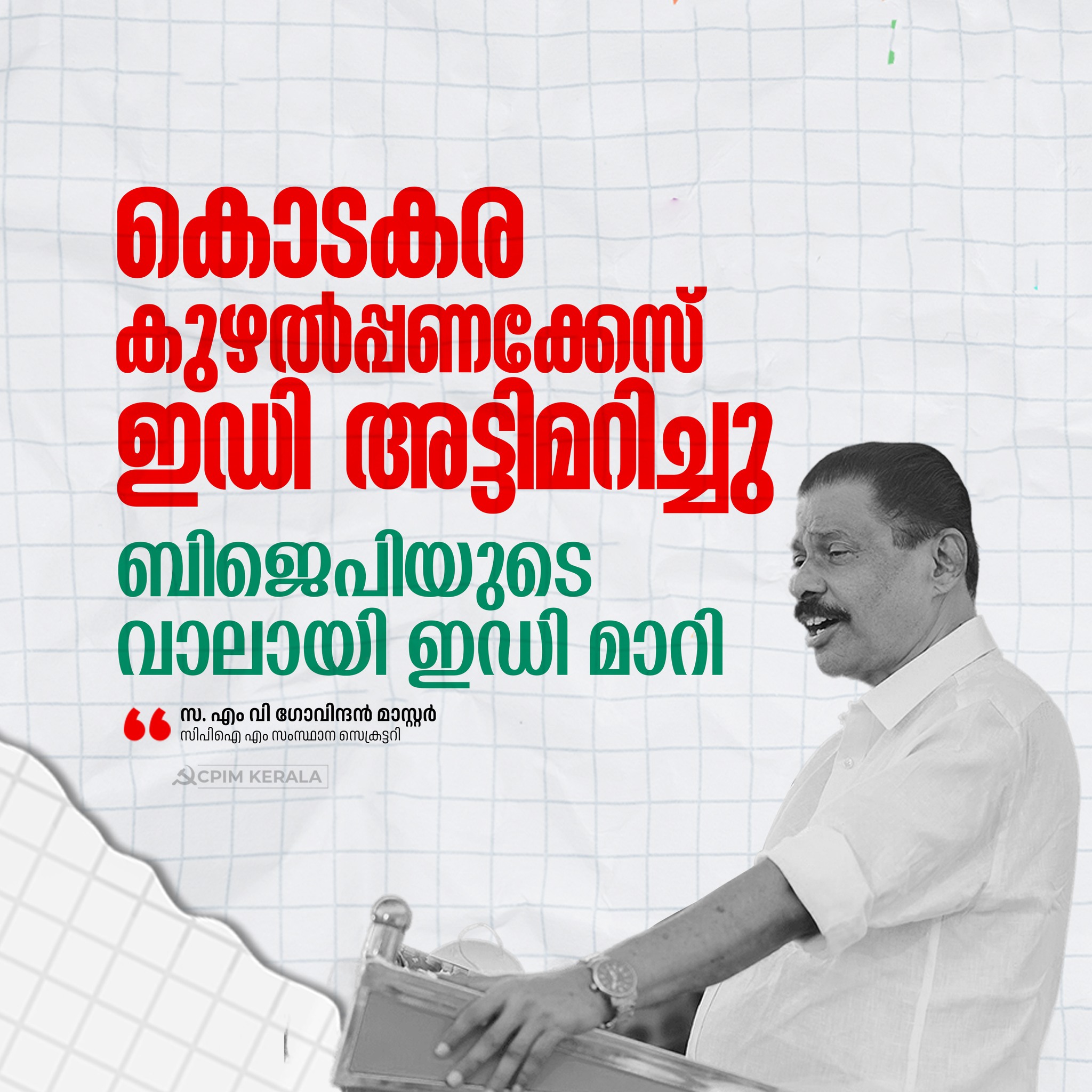 കൊടകര കുഴൽപ്പണക്കേസ് ഇഡി അട്ടിമറിച്ചു. കൊടകര കേസ് ശാസ്ത്രീയമായി എങ്ങനെ ഇല്ലാതാക്കാം എന്നതിന്റെ തെളിവാണ് ഇഡിയുടെ കുറ്റപത്രം. പൊലീസ് തെളിവുകളുടെ പശ്ചാത്തലത്തിലാണ് കേസിൽ ഇഡി അന്വേഷണം ആവശ്യപ്പെട്ടത്. എന്നാൽ ഇഡിയെ പറ്റിയുള്ള അഭിപ്രായം ശരിവെക്കുന്നതാണ് ഇപ്പോഴത്തെ കുറ്റപത്രം. ബിജെപിയുടെ വാലായി മാറിയ ഇഡി രാഷ്ട്രീയപ്രേരിത ഇടപെടല് നടത്തി. ബിജെപിക്കായി ചാര്ജ് ഷീറ്റ് മാറ്റിയെഴുതിയാണ് ഇഡി കോടതിയില് എത്തിച്ചത്. കോടിക്കണക്കിന് രൂപ ബിജെപി ഓഫീസില് എത്തിച്ചെന്ന് ബിജെപി തൃശൂർ ഓഫീസ് മുൻ സെക്രട്ടറി തിരൂർ സതീഷിന്റെ മൊഴിയുണ്ടായിരുന്നു. എന്നാല് ഇഡി സതീഷിന്റെ മൊഴിയെടുത്തില്ല. ബിജെപിയെ കേസില് നിന്ന് ഇഡി രക്ഷപ്പെടുത്തുകയായിരുന്നു.