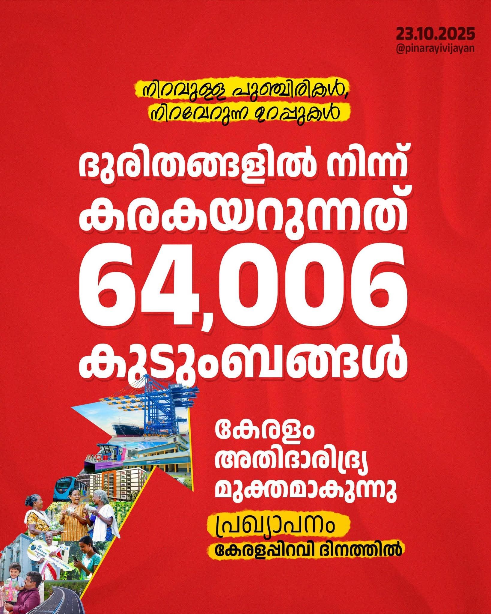 2021-ൽ അധികാരത്തിലെത്തിയ ഇടതുപക്ഷ ജനാധിപത്യ മുന്നണി സർക്കാരിന്റെ ആദ്യ മന്ത്രിസഭാ യോഗത്തിലെ ആദ്യ തീരുമാനമായിരുന്നു അതിദരിദ്രരില്ലാത്ത കേരളം യാഥാർഥ്യമാക്കാനുള്ള പ്രവർത്തനങ്ങൾ. ഏറ്റവും ദുർബലനായ മനുഷ്യനെയും ചേർത്തുപിടിക്കുന്ന സാമൂഹ്യനീതിയുടെയും തുല്യതയുടെയും മാതൃകയാണ് കേരളം ലോകത്തിനു മുന്നിൽ സമർപ്പിക്കുന്നത്. സമൃദ്ധിയും സമത്വവും പുലരുന്ന നവകേരളത്തിനായി നാം നടത്തുന്ന പ്രയത്നങ്ങൾക്കു പ്രചോദനം പകരുന്ന നേട്ടമാണിത്. തികഞ്ഞ അഭിമാനത്തോടെ, കരുത്തോടെ ഒറ്റക്കെട്ടായി നമുക്കു മുന്നോട്ടു പോകാം.