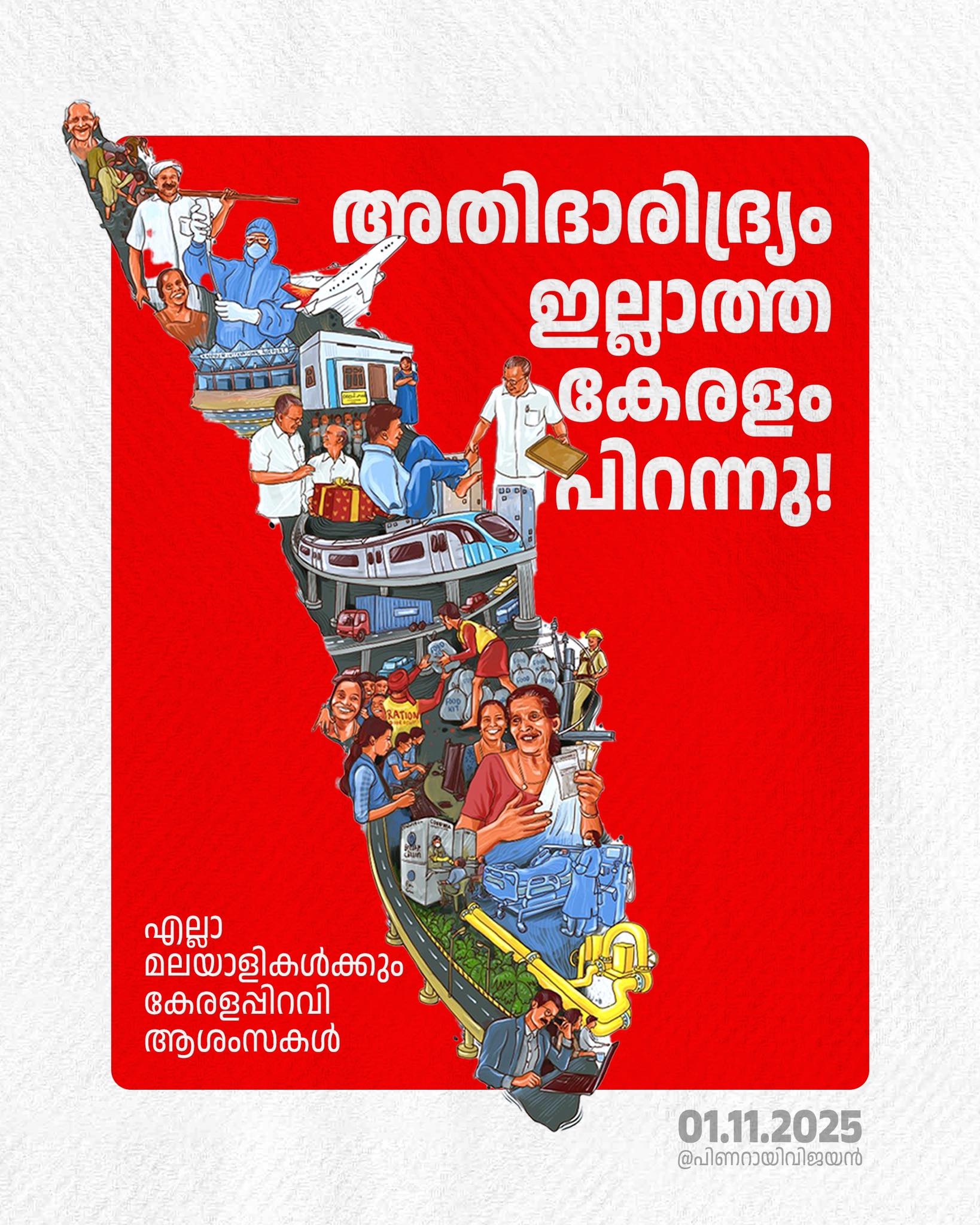 ഭാഷാടിസ്ഥാനത്തില്‍ സംസ്ഥാനം രൂപംകൊണ്ടതിന്റെ ഓര്‍മ്മ പുതുക്കുന്ന ഈ വേളയില്‍, ചരിത്രത്തില്‍ സുവര്‍ണ്ണ ലിപികളാല്‍ എഴുതിച്ചേര്‍ക്കേണ്ട ഒരു സുപ്രധാന പ്രഖ്യാപനത്തിന് കൂടി കേരളം സാക്ഷ്യം വഹിക്കുകയാണ്. ലോകത്തിലെ തന്നെ വിരലിലെണ്ണാവുന്ന പ്രദേശങ്ങള്‍ മാത്രം കൈവരിച്ചതും, ഏതൊരു പുരോഗമന സമൂഹവും സ്വപ്നം കാണുന്നതുമായ 'അതിദാരിദ്ര്യമുക്ത സംസ്ഥാനം' എന്ന പദവിയിലേക്ക് കേരളം ഉയരുകയാണ്. വെറും കണക്കുകളിലെ നേട്ടത്തിനപ്പുറം, കഴിക്കാന്‍ ഭക്ഷണമില്ലാത്ത, താമസിക്കാന്‍ വീടില്ലാത്ത, സൗജന്യ ചികിത്സ ലഭിക്കാത്ത ഒരാള്‍പോലും ഈ കേരളത്തിലില്ല എന്ന് ഉറപ്പുവരുത്തുന്നതാണ് ഈ പ്രഖ്യാപനം, ലോകമാകെയുള്ള മലയാളികള്‍ക്ക് അഭിമാനിക്കാവുന്ന ഒരു മാനവിക മാതൃകയാണിത്.