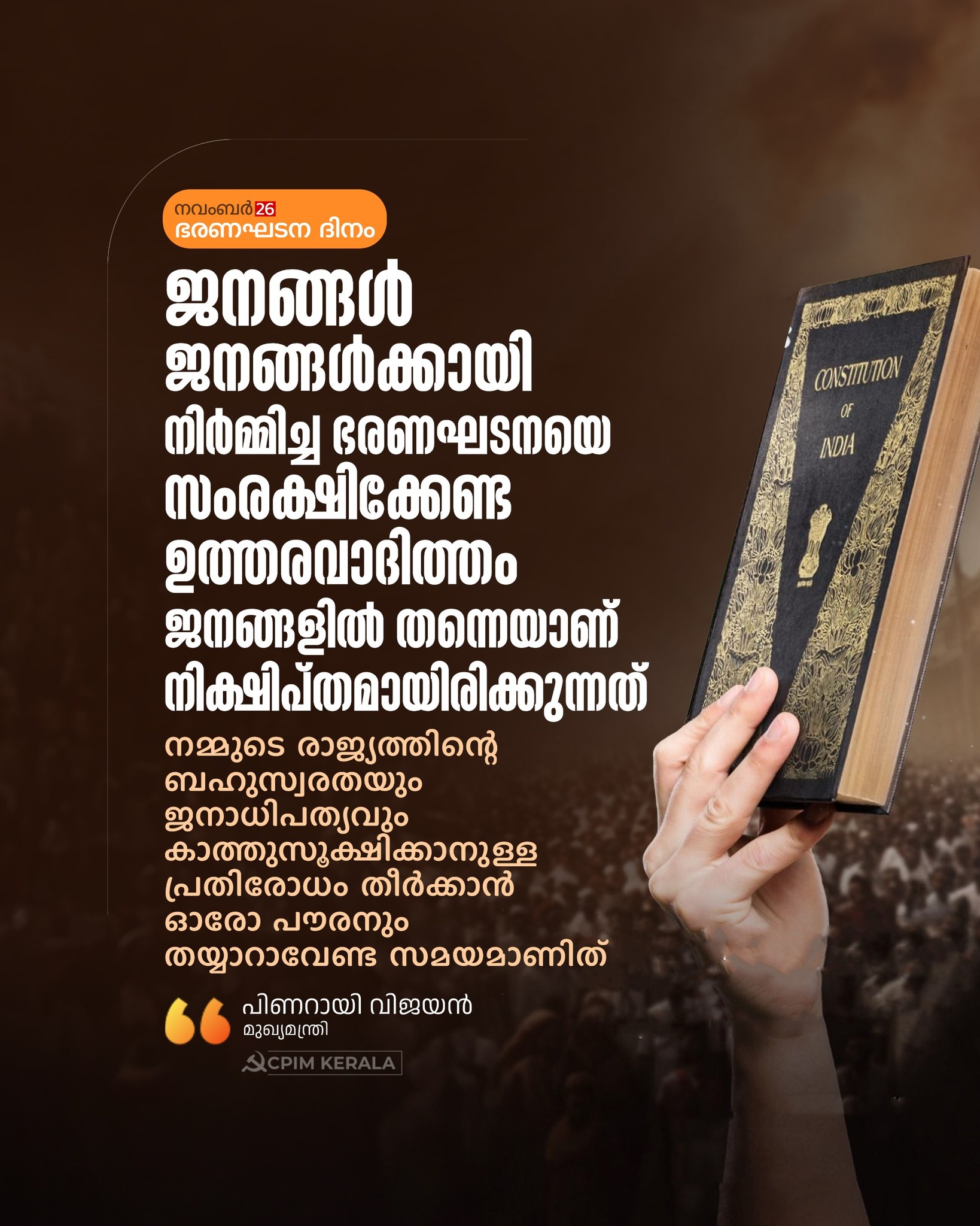 അതുകൊണ്ട് ഈ ദിനം വെറുമൊരു ഓർമ്മപുതുക്കലല്ല. ജനങ്ങൾ ജനങ്ങൾക്കായി നിർമ്മിച്ച ഭരണഘടനയെ സംരക്ഷിക്കേണ്ട ഉത്തരവാദിത്തം ജനങ്ങളിൽ തന്നെയാണ് നിക്ഷിപ്തമായിരിക്കുന്നത്. നമ്മുടെ രാജ്യത്തിൻ്റെ ബഹുസ്വരതയും ജനാധിപത്യവും കാത്തുസൂക്ഷിക്കാനുള്ള പ്രതിരോധം തീർക്കാൻ ഓരോ പൗരനും തയ്യാറാവേണ്ട സമയമാണിത്.
