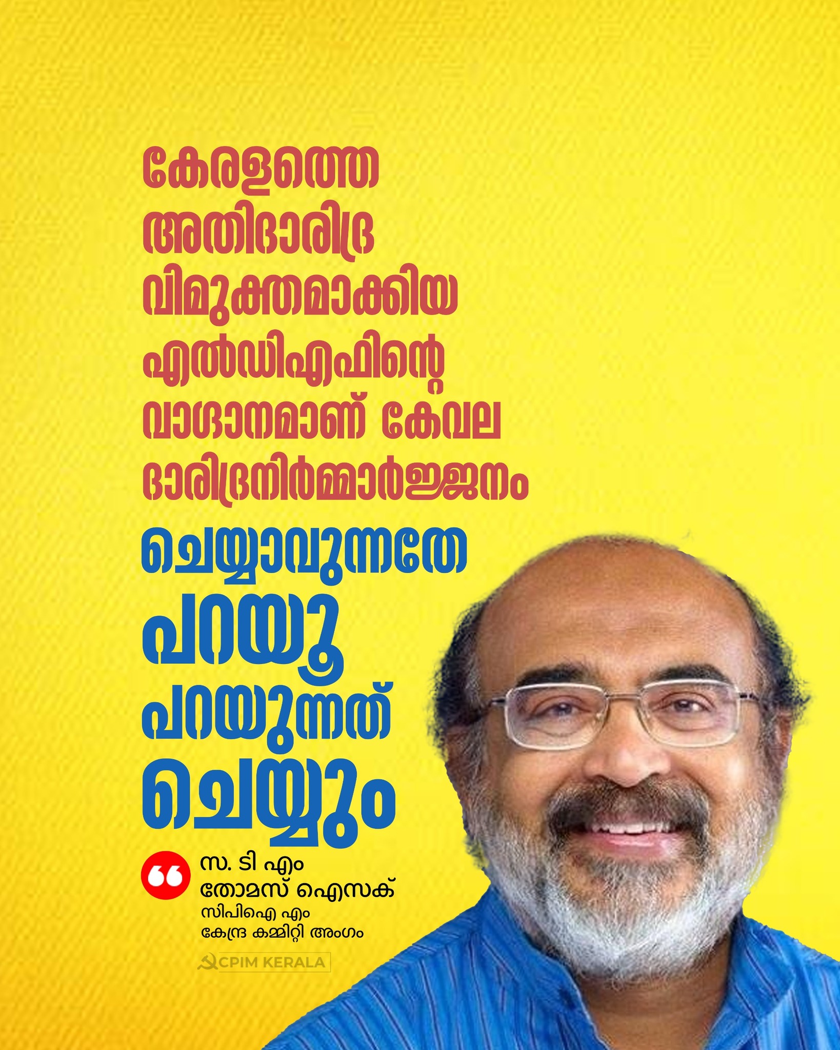 അവരെയെല്ലാം ദാരിദ്ര്യത്തിൽ നിന്ന് കരകയറ്റാൻ ആയിരിക്കും ഇനി കേരളത്തിലെ യജ്ഞം. ഇതൊന്നും വീൺവാക്കാവില്ല. കേരളത്തെ അതിദാരിദ്രവിമുക്തമാക്കിയ എൽഡിഎഫ് ന്റെ വാഗ്ദാനമാണ് കേവല ദാരിദ്രനിർമ്മാർജ്ജനം. ചെയ്യാവുന്നതേ പറയൂ. പറയുന്നത് ചെയ്യും.