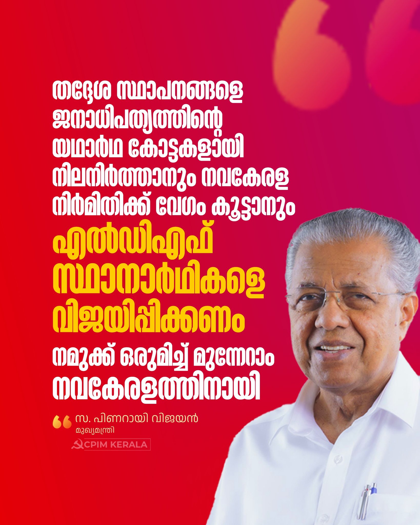 ഈ തെരഞ്ഞെടുപ്പ് വികസനവും വികസന വിരുദ്ധതയും തമ്മിലുള്ള പോരാട്ടമാണ്. അഴിമതിയില്ലാത്ത, വേഗത്തിൽ സേവനം നൽകുന്ന കെ- സ്മാർട്ട് തുടരണോ, ഭവനരഹിതർക്ക് സ്വന്തം വീട് നൽകുന്ന ലൈഫ് മിഷൻ പൂർത്തിയാക്കണോ, സ്ത്രീകളെ ശാക്തീകരിക്കുന്ന കുടുംബശ്രീ കൂടുതൽ ഉയരങ്ങളിലെത്തണോ, നാടിന്റെ ശുചിത്വം ഉറപ്പാക്കുന്ന മാലിന്യ സംസ്കരണ സംവിധാനങ്ങൾ വിജയിക്കണോ എന്നതൊക്കെയാണ് മുന്നിലുള്ള ചോദ്യങ്ങൾ. എങ്കിൽ ഈ തെരഞ്ഞെടുപ്പിൽ ഇടതുപക്ഷത്തിന്റെ വിജയം ഉറപ്പാക്കേണ്ടതുണ്ട്. വർഗീയത വളർത്താൻ ശ്രമിക്കുന്ന ബിജെപിക്കും അവസരവാദ രാഷ്ട്രീയം കളിക്കുന്ന കോൺഗ്രസിനും കേരളത്തിന്റെ മണ്ണിൽ ഇടമില്ലെന്ന് നമുക്ക് തെളിയിക്കാം. തദ്ദേശ സ്ഥാപനങ്ങളെ ജനാധിപത്യത്തിന്റെ യഥാർഥ കോട്ടകളായി നിലനിർത്താനും നവകേരള നിർമിതിക്ക് വേഗം കൂട്ടാനും എൽഡിഎഫ് സ്ഥാനാർഥികളെ വിജയിപ്പിക്കണം. നമുക്ക് ഒരുമിച്ച് മുന്നേറാം, നവകേരളത്തിനായി.