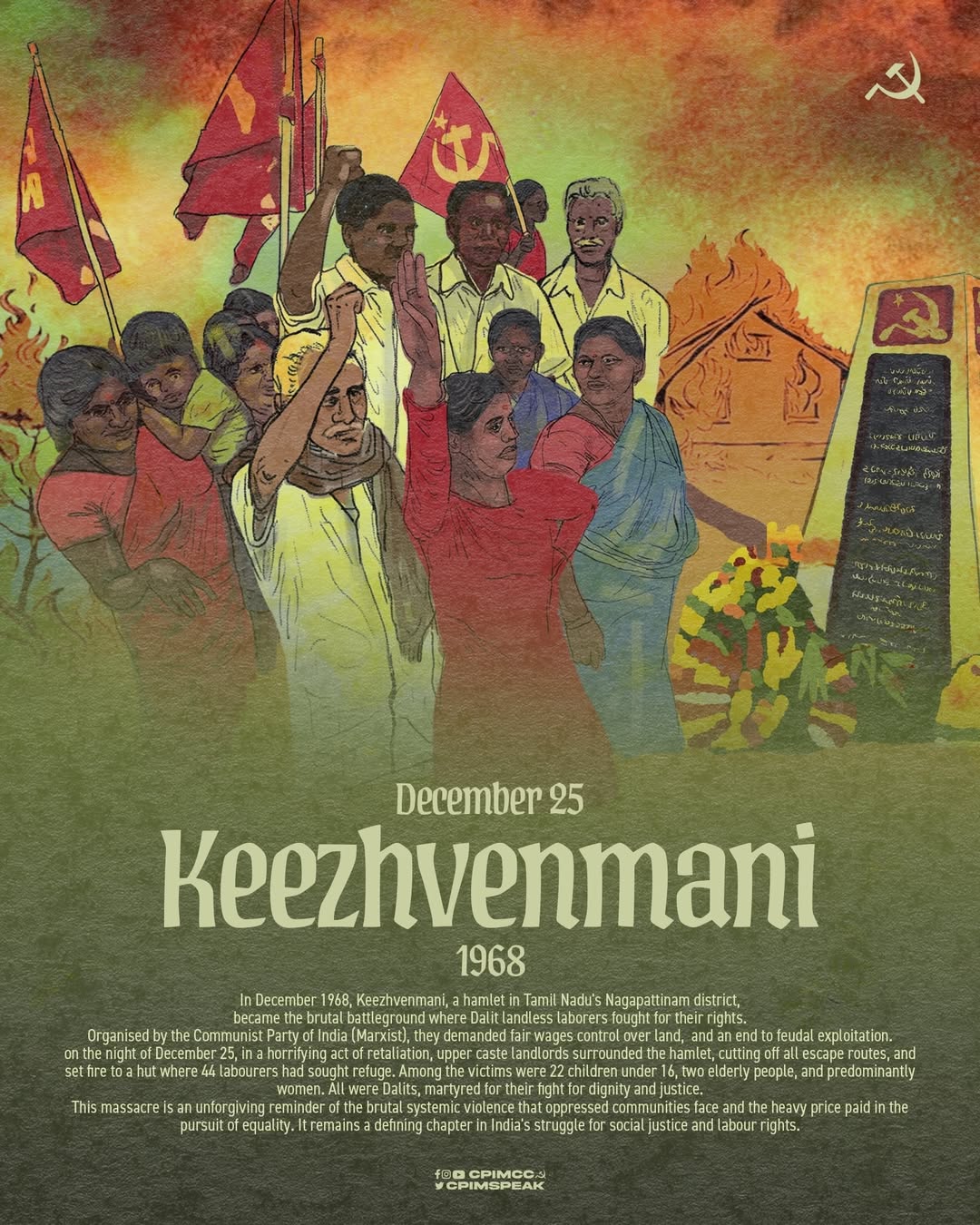 കീഴ്വെണ്മണിയില് സിപിഐ എമ്മിന്റെ നേതൃത്വത്തില് 1968ല് നടന്ന ഐതിഹാസികമായ ആ ഭൂസമരത്തിനെതിരെ ഭൂവുടമകളായ സവര്ണ മേലാളര് പ്രതികരിച്ചത് 44 ദളിത് കര്ഷകത്തൊഴിലാളികളെ ചുട്ടുകൊന്നുകൊണ്ടായിരുന്നു. ഡിസംബര് 25ന് അര്ധരാത്രിയിലായിരുന്നു സ്വതന്ത്ര ഇന്ത്യ കണ്ട ഏറ്റവും മൃഗീയമായ കൂട്ടക്കൊലകളിൽ ഒന്നായി മാറിയ സംഭവം. തമിഴ്നാടിന്റെ നെല്ലറയായ തഞ്ചാവൂരിലാകെ സിപിഐ എം നേതൃത്വത്തിൽ കർഷക തൊഴിലാളികൾ മാന്യമായ ജീവിതത്തിനും കൂലി വർധനവിനും വേണ്ടി സമര രംഗത്തിറങ്ങിയ കാലം. തീർത്തും ദയനീയമായ അവസ്ഥയിൽ കഴിയുന്ന തൊഴിലാളികൾ, സ്വന്തമായി ഭൂമിയില്ലാത്ത കൂരകളിൽ താമസിക്കുന്ന ദളിതർ, അപ്പുറത്ത് ആയിരക്കണക്കിന് ഏക്കർഭൂമി സ്വന്തമായുള്ള ജന്മിമാർ (എന്തിനും അധികാരമുള്ള പണ്ണയാർമാർ) ഏതൊരു സ്വാതന്ത്ര്യവുമില്ലാത്ത അടിമകളായിരുന്നു അക്കാലത്ത് കർഷക തൊഴിലാളികൾ.