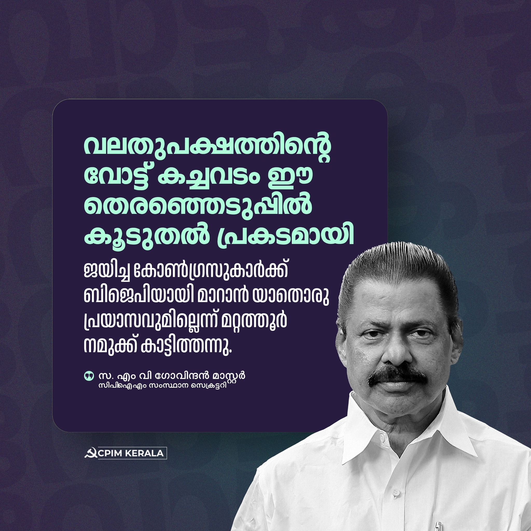 ബിജെപിയുടെ രാഷ്ട്രീയം കോൺഗ്രസ് ഉപയോഗിക്കുകയായിരുന്നു. ഇതുവഴി ബിജെപിയുടെ ബി ടീം ആകുകയാണ് കോൺഗ്രസ്. കോൺഗ്രസ് അണികളിൽതന്നെ ഇത് വലിയ പ്രശ്നത്തിനിടയാക്കിയിട്ടുണ്ട്. ഹിന്ദുത്വ രാഷ്ട്രീയത്തെ പ്രതിരോധിക്കാൻ ഉത്തരേന്ത്യയിൽ കോൺഗ്രസ് നടപ്പാക്കുന്ന അതേ രീതി ഇവിടെയും പ്രയോഗിക്കുന്നു. ഇതുവഴി കേരളത്തിന്റെ മത നിരപേക്ഷ ഉള്ളടക്കമാണ് കോൺഗ്രസ് തകർക്കുന്നത്. വാളയാറിൽ ചത്തീസ്ഗഡ് സ്വദേശിയെ ആർഎസ്എസുകാർ തല്ലിക്കൊന്നപ്പോൾ പ്രതികൾ ആർഎസ്എസുകാരാണെന്ന് പറയാൻ പ്രതിപക്ഷ നേതാവ് വി ഡി സതീശൻ തയ്യാറായില്ല. വട്ടിയൂർക്കാവ് എംഎൽഎ ഓഫീസ് ഒഴിയണമെന്ന ബിജെപി കൗൺസിലറുടെ ആവശ്യത്തിന് കോൺഗ്രസ് നേതാവ് കെ മുരളീധരൻ അടക്കമുള്ളവർ പിന്തുണയ്ക്കുന്നു. ഇതെല്ലാം ബിജെപിയുമായി കോൺഗ്രസിനുള്ള കൂട്ടുകെട്ടിന്റെ ഭാഗമാണ്. കേരള സമൂഹം ഇത് തിരിച്ചറിയും.