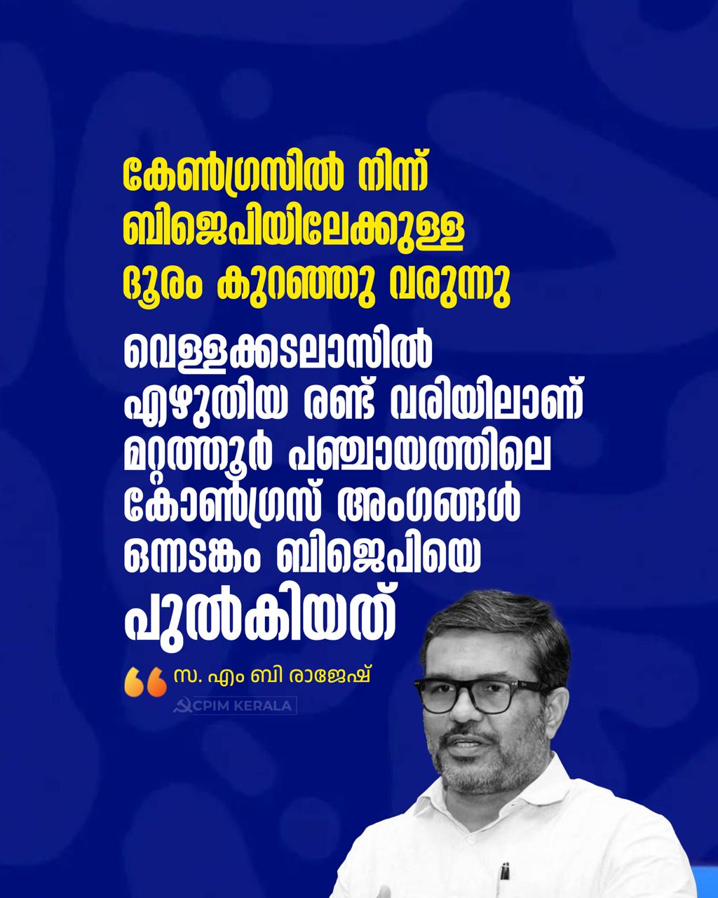 ആയിരുന്നെങ്കിലോ? എന്തൊരു കാപട്യമാണിവർക്ക്? മറ്റത്തൂരിലെ കോൺഗ്രസ് ബിജെപി ആയതിലും ഇവർക്ക് പരാതിയില്ല. കുമരകത്ത് ഭൂരിപക്ഷമുള്ള എൽഡിഎഫിനെ തോൽപ്പിക്കാൻ ബിജെപി വോട്ട് വാങ്ങി പ്രസിഡണ്ട് സ്ഥാനം നേടിയതിലും ഇവർക്ക് പരാതിയില്ല. ഇവരുടെ വിരോധം ബിജെപിയോടല്ല, എൽഡിഎഫിനോടാണ്. കമ്മ്യൂണിസ്റ്റുകാരോടാണ്. കമ്മ്യൂണിസ്റ്റുകാർക്കും ഇടതുപക്ഷത്തിനും എതിരെ അവർക്ക് ബിജെപി വിശ്വസ്ത കൂട്ടാളികളാണ്. ഇടതുപക്ഷത്തിനെതിരായ സകല വർഗീയ- വലതുപക്ഷ ശക്തികളുടെയും എല്ലാം മറന്നുള്ള ഐക്യമാണ് പണിപ്പുരയിൽ ഒരുങ്ങുന്നത്.