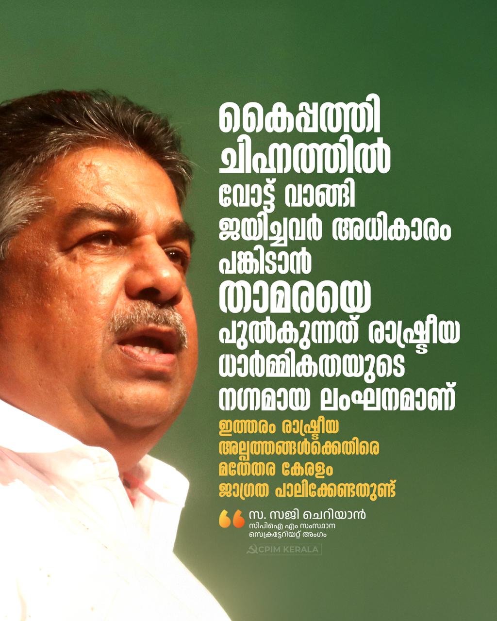 ഇന്ത്യയുടെ വിവിധ സംസ്ഥാനങ്ങളിൽ ബിജെപി അധികാരം പിടിച്ചെടുക്കാൻ ഉപയോഗിച്ച അതേ 'ചാക്കിട്ടുപിടുത്തം' കേരളത്തിലും പയറ്റാൻ അവർക്ക് കോൺഗ്രസ് തന്നെ പാലമിട്ടു നൽകുന്നു എന്നത് ഗൗരവകരമാണ്. മതേതരത്വം പ്രസംഗിക്കുകയും പ്രവർത്തിയിൽ വർഗീയതയ്ക്ക് വളമിടുകയും ചെയ്യുന്ന കോൺഗ്രസിന്റെ ഇരട്ടത്താപ്പാണ് ഇവിടെ വെളിവാകുന്നത്. എൽ.ഡി.എഫ് ഭരണം തടയാൻ വേണ്ടി വർഗീയ ശക്തികളുമായി കൈകോർക്കുന്നതിലൂടെ തങ്ങളെ വിജയിപ്പിച്ച വോട്ടർമാരെയും പരസ്യമായി വഞ്ചിക്കുകയാണ് ഇവർ ചെയ്തത്.