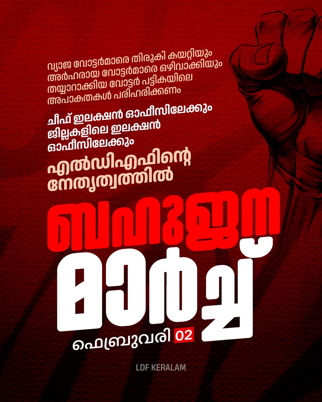 വ്യാജ വോട്ടര്മാരെ തിരുകി കയറ്റിയും അര്ഹരായ വോട്ടര്മാരെ ഒഴിവാക്കിയും തയ്യാറാക്കിയ വോട്ടര് പട്ടികയിലെ അപാകതകള് പരിഹരിക്കണമെന്ന് ആവശ്യപ്പെട്ടുകൊണ്ട് ഫെബ്രുവരി 2-ന് തിരുവനന്തപുരത്ത് ചീഫ് ഇലക്ഷന് ഓഫീസിലേക്കും ജില്ലകളിലെ ഇലക്ഷന് ഓഫീസിലേക്കും എല്ഡിഎഫിന്റെ നേതൃത്വത്തില് ബഹുജന മാര്ച്ച് സംഘടിപ്പിക്കും.