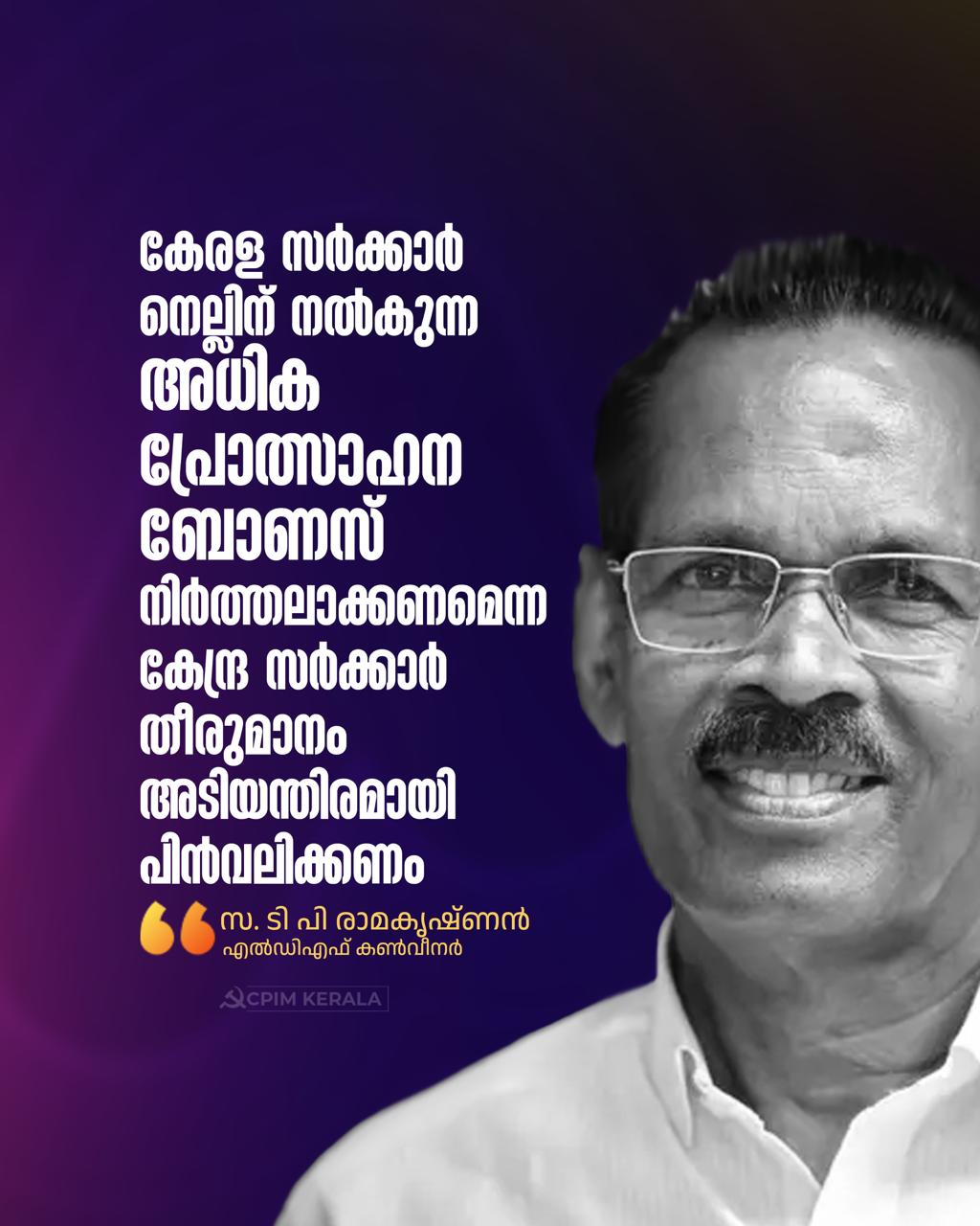 കേരള സര്ക്കാര് നെല്ലിന് നല്കുന്ന അധിക പ്രോത്സാഹന ബോണസ് നിര്ത്തലാക്കണമെന്ന കേന്ദ്ര സര്ക്കാരിന്റെ തീരുമാനം അടിയന്തിരമായി പിന്വലിക്കണം. നെല്ലിന് സംസ്ഥാനം നല്കുന്ന അധിക ബോണസ് തുക നിര്ത്തലാക്കണമെന്നാവശ്യപ്പെട്ട് കേന്ദ്ര ധനകാര്യ എക്സ്പെന്റീച്ചര് സെക്രട്ടറി സംസ്ഥാന ചീഫ് സെക്രട്ടറിക്ക് കത്തയച്ചിരിക്കുകയാണ്. സംസ്ഥാനങ്ങള് നല്കുന്ന ഈ അധിക ബോണസ് മൂലം ഗോതമ്പും, അരിയും രാജ്യത്ത് അധികമായി സംഭരിക്കുകയാണെന്നും, ഇത് പൊതുഗജനാവിന് ബാധ്യതയാണെന്നുമുള്ള നിലപാടാണ് കേന്ദ്ര സര്ക്കാര് സ്വീകരിച്ചിരിക്കുന്നത്. അധിക ബോണസിലൂടെ ധാന്യങ്ങള് കൂടുതല് കൃഷി ചെയ്യുകയും, ഉല്പ്പാദന വര്ദ്ധനവ് ഉണ്ടാവുകയും ചെയ്യുന്നുവെന്നാണ് കത്തില് പറഞ്ഞിരിക്കുന്നത്. നമ്മുടെ ഭക്ഷ്യ സ്വയം പര്യാപ്തതയെ തന്നെ ദുര്ബലപ്പെടുത്തുന്നതിനുള്ള ഇടപെടലാണിത്.