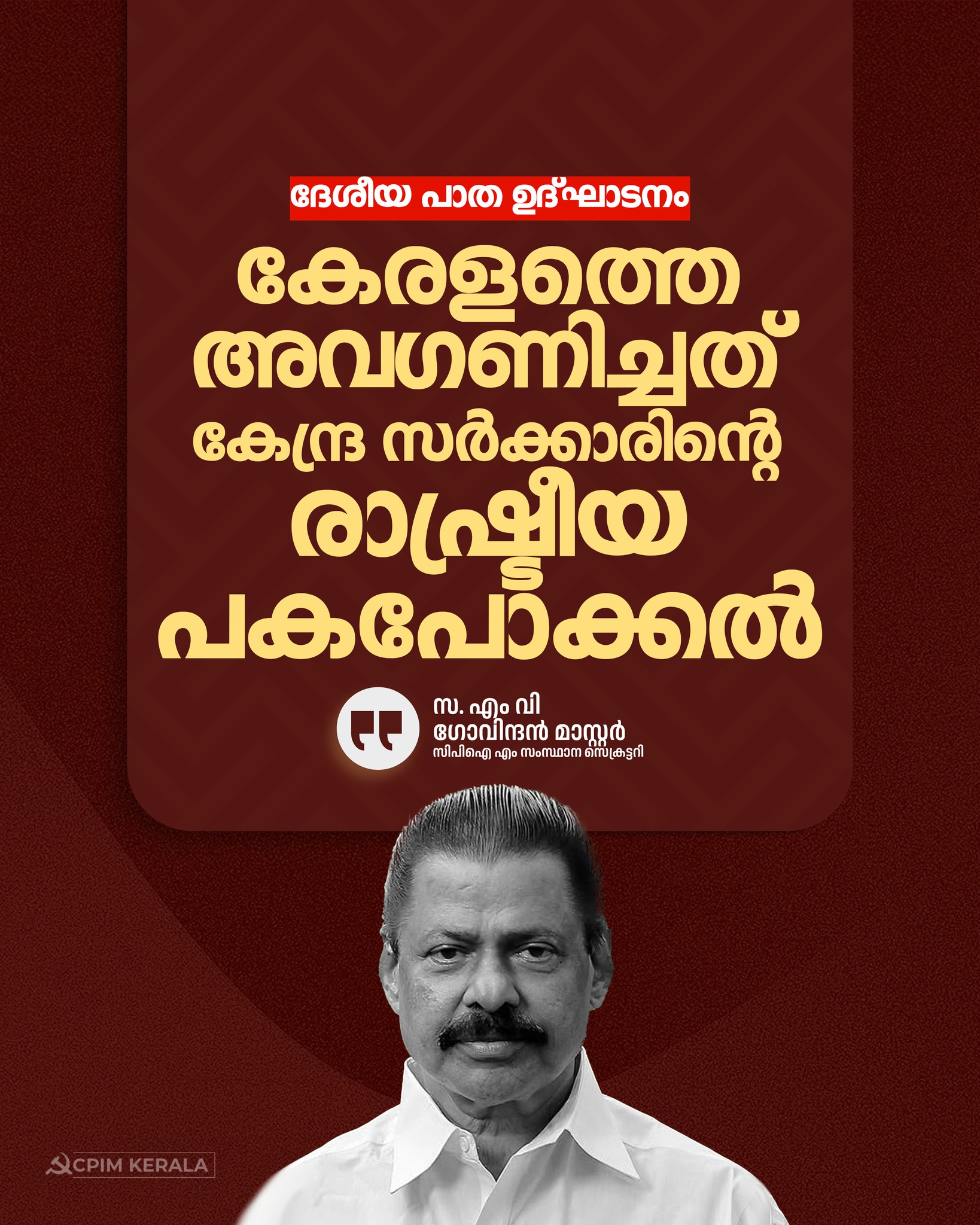 ദേശീയ പാത ഉദ്ഘാടന ചടങ്ങിൽ കേരളത്തിന് അർഹമായ പ്രാതിനിധ്യം നൽകാത്തത് സംസ്ഥാനത്തോടുള്ള അവഹേളനമാണ്. വിഷയത്തിൽ ശക്തമായ പ്രതിഷേധം രേഖപ്പെടുത്തുന്നു. കേരളത്തെ സംബന്ധിച്ച് അഭിമാനകരമായ നേട്ടത്തിന്റെ വിളംബരമാണ് ദേശീയപാതയുടെ ഉദ്ഘാടന ചടങ്ങ്. കക്ഷിരാഷ്ട്രീയത്തിനതീതമായാണ് പരിപാടിയെ കാണേണ്ടിയിരുന്നത്. എന്നാൽ രാഷ്ട്രീയ പക്ഷപാതപരമായ നിലപാടിന്റെ വേദിയാക്കി കേന്ദ്രസർക്കാരിന്റെ പരിപാടിയാക്കി ഇതിനെ മാറ്റി. കേരളത്തിൽ ദേശീയ പാത വികസനം അസാധ്യമാണെന്നും ഭൂമി ഏറ്റെടുക്കാനാവില്ലെന്നും മുൻ മുഖ്യമന്ത്രി ഉമ്മൻചാണ്ടി നിലപാട് സ്വീകരിച്ചതിനെത്തുടർന്നാണ് ദേശീയപാത അതോറിറ്റി എൻഎച്ച് 66 വികസനം ഉപേക്ഷിച്ചത്. എൽഡിഎഫ് അധികാരത്തിൽ വന്നപ്പോൾ കേരളത്തിന് അനിവാര്യമായ ഒന്നാണ് ദേശീയപാത വികസനം എന്ന് വ്യക്തമാക്കി ചർച്ചകൾ നടത്തിയതിനു ശേഷമാണ് വികസനം ആരംഭിച്ചത്. എല്ലാ രീതിയിലും ഇടപെടൽ നടത്തിയതും, പ്രവർത്തനങ്ങൾ കൃത്യമായി ഏകോപിപ്പിച്ചതും പൊതുമരാമത്ത് വകുപ്പ് മന്ത്രി പി എ മുഹമ്മദ് റിയാസാണ്.