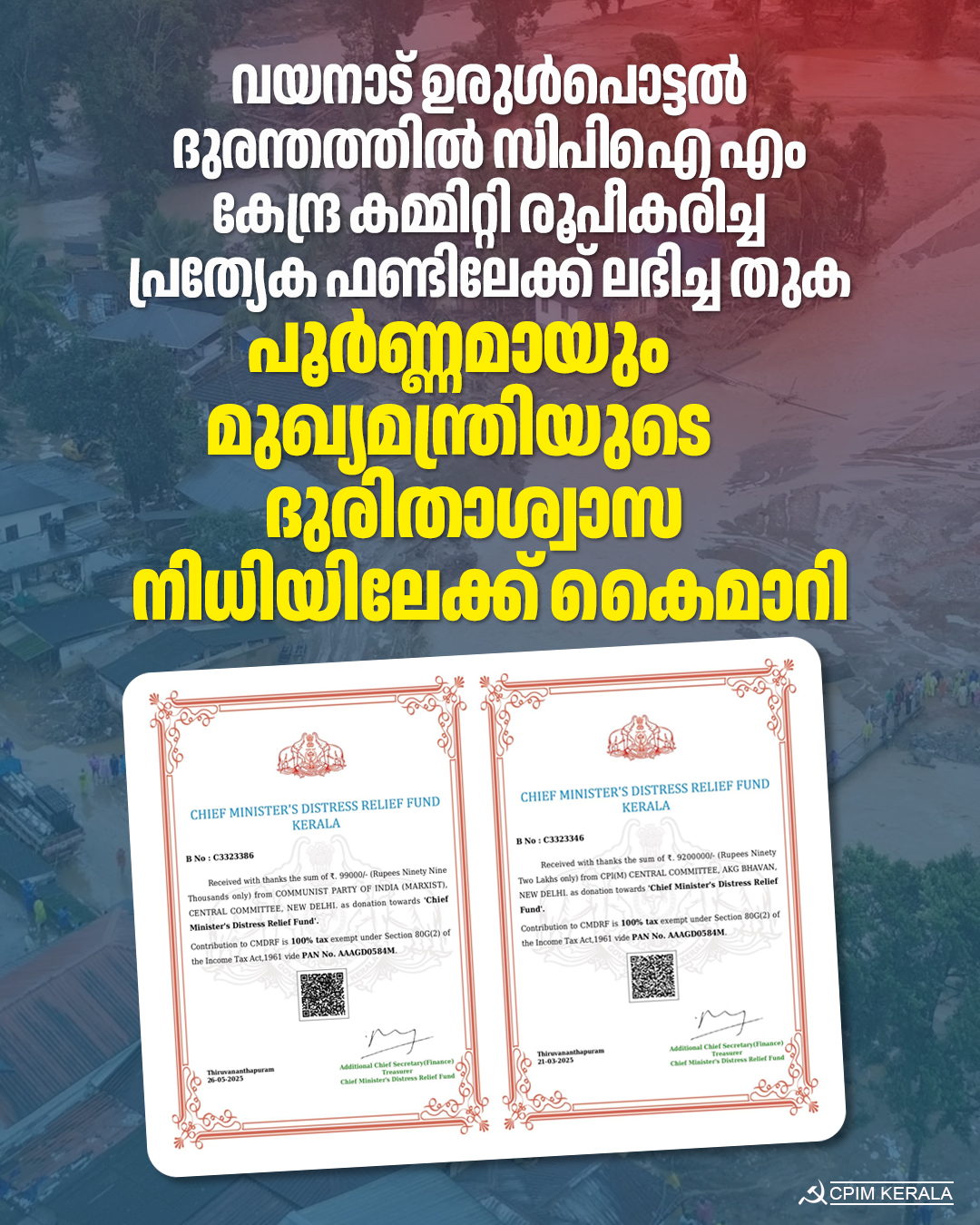 പഞ്ചാബ് ആൻഡ് സിന്ധ് ബാങ്കിലെ 07621000432853 എന്ന അക്കൗണ്ട് നമ്പറിലൂടെയാണ് പാർടി ദുരിതാശ്വാസ നിധി സമാഹരിച്ചത്. രണ്ട് ഘട്ടങ്ങളിലായാണ് ഈ തുക സിഎംഡിആർഎഫിലേക്ക് കൈമാറിയത്. 2025 മാർച്ച് 21-ന് 92,00,000 രൂപയും 2025 മെയ് 26-ന് 99,000 രൂപയുമാണ് കൈമാറിയത്. ഇതിനുപുറമെ, പാർടിയുടെ വിവിധ ബഹുജന സംഘടനകളും വലിയ തുകകൾ ദുരിതാശ്വാസ നിധിയിലേക്ക് നൽകിയിട്ടുണ്ട്.
