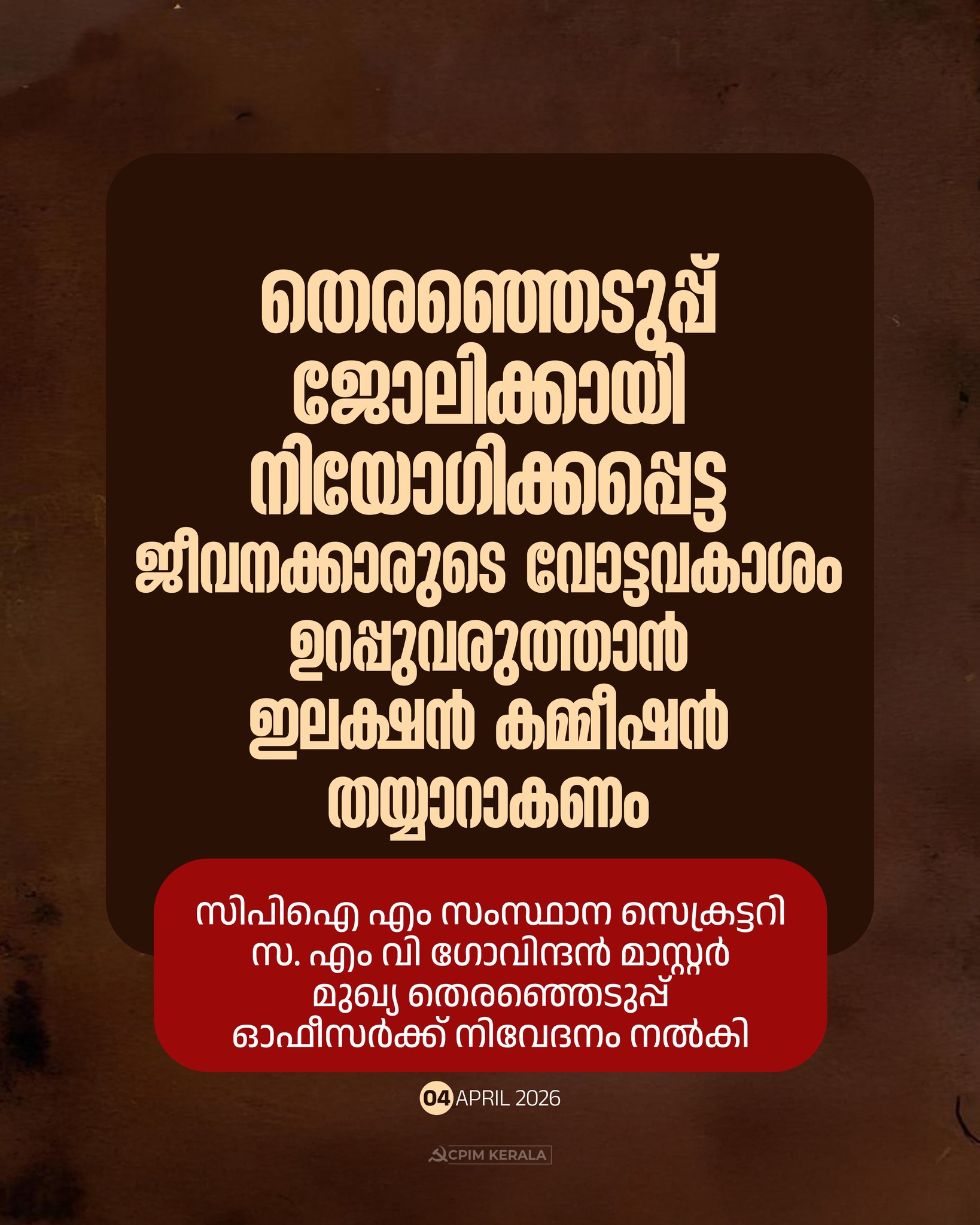 തെരഞ്ഞെടുപ്പ് ജോലിക്കായി നിയോഗിക്കപ്പെട്ട ജീവനക്കാരുടെ വോട്ടവകാശം ഉറപ്പുവരുത്താന് ഇലക്ഷന് കമ്മീഷന് തയ്യാറാകണമെന്ന് ആവശ്യപ്പെട്ടുകൊണ്ട് സിപിഐ എം സംസ്ഥാന സെക്രട്ടറി മുഖ്യ തെരഞ്ഞെടുപ്പ് ഓഫീസര്ക്ക് നിവേദനം നല്കി. നേരത്തെയുണ്ടായിരുന്ന തപാല്വഴി വോട്ട് ചെയ്യാനുള്ള സൗകര്യം ഇല്ലാതാക്കി കൊണ്ടു വന്ന പുതിയ സംവിധാനം ധാരാളം അവ്യക്തകളും സങ്കീര്ണ്ണതകളും നിറഞ്ഞതാണ്. പോളിംഗ് ഡ്യൂട്ടിക്ക് നിയമിക്കപ്പെട്ട ജീവനക്കാര്, തെരഞ്ഞെടുപ്പുമായി ബന്ധപ്പെട്ട മറ്റ് ജീവനക്കാര്, അവശ്യസര്വ്വീസില് ഉള്പ്പെട്ട ജീവനക്കാര് എന്നിവര്ക്കെല്ലാം സമ്മതിദാന അവകാശം വിനിയോഗിക്കാനുള്ള സംവിധാനം ഉറപ്പുവരുത്തേണ്ട അധികാരികള് ഇക്കാര്യത്തില് തികഞ്ഞ അലംഭാവമാണ് കാണിക്കുന്നത്.