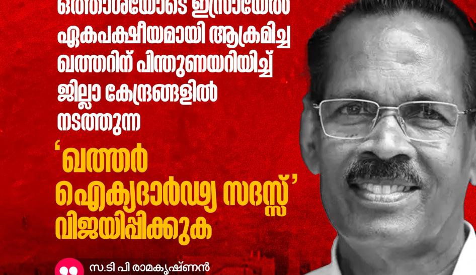 അമേരിക്കയുടെ ഒത്താശയോടെ ഇസ്രായേൽ ഏകപക്ഷീയമായി ആക്രമിച്ച ഖത്തറിന് പിന്തുണയറിയിച്ച് ഇന്ന് (സെപ്റ്റംബർ 23) ജില്ലാ കേന്ദ്രങ്ങളിൽ നടത്തുന്ന ‘ ഖത്തർ ഐക്യദാർഢ്യ സദസ്സ് ’ വിജയിപ്പിക്കണമെന്ന് അഭ്യർഥിക്കുന്നു.