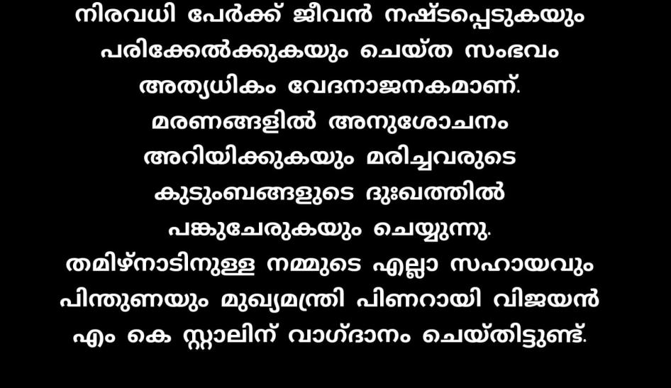 കരൂരിൽ തമിഴക വെട്രി കഴകത്തിന്റെ റാലിക്കിടെയുണ്ടായ അപകടത്തിൽ നിരവധി പേർക്ക് ജീവൻ നഷ്ടപ്പെടുകയും പരിക്കേൽക്കുകയും ചെയ്ത സംഭവം അത്യധികം വേദനാജനകമാണ്. മരണങ്ങളിൽ അനുശോചനം അറിയിക്കുകയും മരിച്ചവരുടെ കുടുംബങ്ങളുടെ ദുഃഖത്തിൽ പങ്കുചേരുകയും ചെയ്യുന്നു.