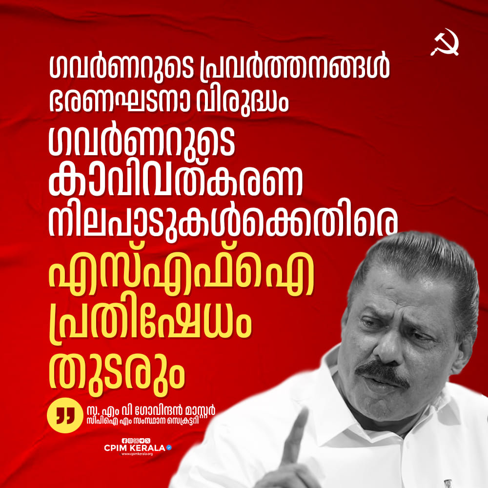 ഗവർണറുടെ പ്രവർത്തനങ്ങൾ ഭരണഘടനാ വിരുദ്ധമാണ്. ഗവർണറുടെ കാവിവത്കരണ നിലപാടുകൾക്കെതിരെ എസ്എഫ്ഐ പ്രതിഷേധം തുടരും. പ്രതിഷേധം വിലക്കാൻ ഇത് ഫാസിസ്റ്റ് രാജ്യമല്ലല്ലോ. ജനാധിപത്യരാജ്യമല്ലേ. എല്ലാവർക്കും പ്രതിഷേധിക്കാനുള്ള അവകാശമുണ്ട്. പ്രതിഷേധം അക്രമത്തിലേക്ക് കടക്കുന്നതിനെയാണ് വിമർശിക്കുന്നത്. എസ്എഫ്ഐ ആത്മസംയനത്തോടെയാണ് പ്രതിഷേധിക്കുന്നത്. ആരും ഗവർണറുടെ വാഹനത്തിന് മുന്നിലേക്കൊന്നും ചാടിയല്ല കരിങ്കൊടി കാണിക്കുന്നത്. എന്നാൽ മുഖ്യമന്ത്രിക്ക് നേരെ അതാണോ നടക്കുന്നത്. കോൺഗ്രസ് ക്രിമിനലുകൾ ആത്മഹത്വ സ്ക്വാഡ് പോലെയാണ് പ്രവർത്തിക്കുന്നത്.