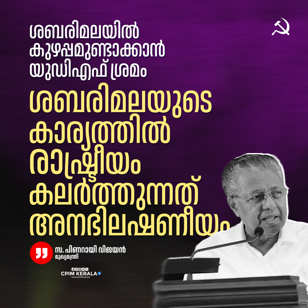 ശബരിമലയിൽ കുഴപ്പമുണ്ടെന്ന് വരുത്തി ജനലക്ഷങ്ങളെ പരിഭ്രാന്തിയിലാക്കുകയാണ് യുഡിഎഫ്. കേന്ദ്ര സർക്കാർ ഇടപെടണമെന്ന് പറഞ്ഞ് യുഡിഎഫ് എം പിമാർ ഡൽഹിയിൽ സമരം ചെയ്യുന്നു. രാഷ്ട്രീയ ലക്ഷ്യമാണ് ഇതിനു പിന്നിൽ. കോൺഗ്രസിന്റെ പ്രത്യേക അജൻഡയാണിത്. അവർക്ക് ഉപദേശങ്ങളുമായി തെരഞ്ഞെടുപ്പ് ലക്ഷ്യമിട്ട് ഏജൻസി പഠിപ്പിക്കുന്നു. സംസ്ഥാനത്തിന് പുറത്തേക്കും തെറ്റായ സന്ദേശം നൽകുന്നു. ശബരിമലയുടെ കാര്യത്തിൽ രാഷ്ട്രീയം കലർത്തുന്നത് അനഭിലഷണീയമാണ്.