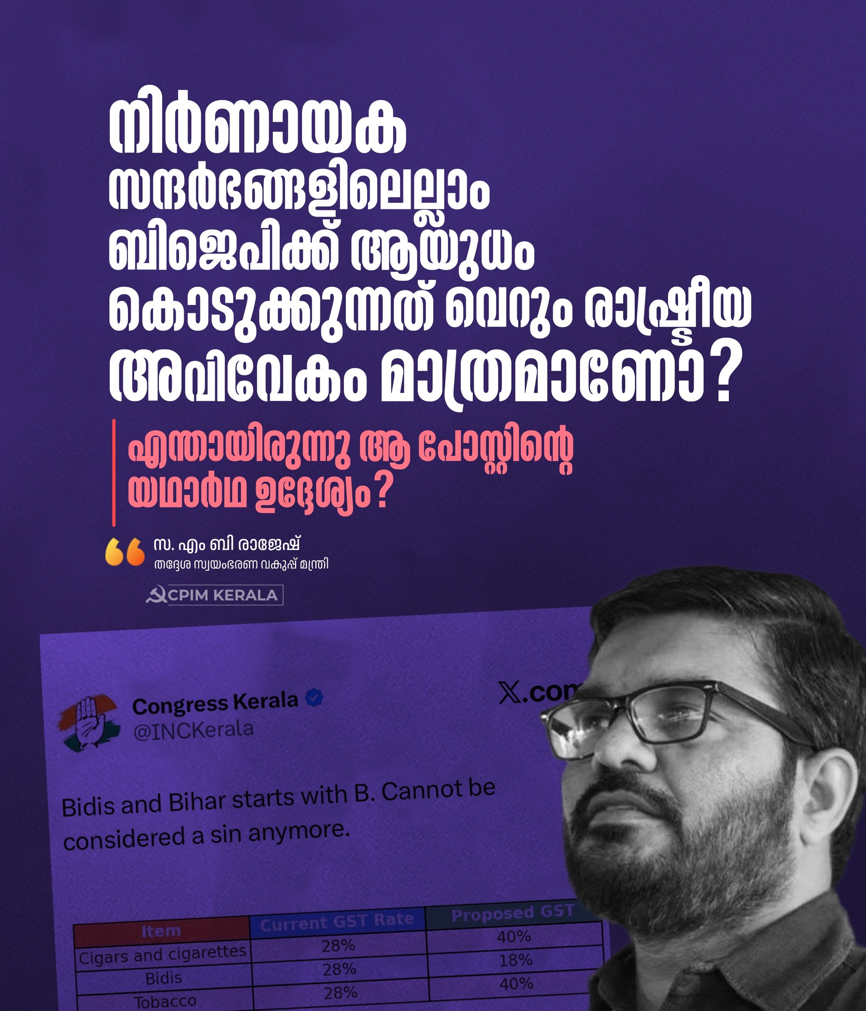രാജ്യം ഉറ്റുനോക്കുന്ന ഒരു തെരഞ്ഞെടുപ്പ് ബിഹാറിൽ നടക്കുകയാണ്. എല്ലാ കുത്സിത തന്ത്രങ്ങളും പയറ്റിയിട്ടും ബി ജെ പിയാകെ അടിപതറി, അങ്കലാപ്പിലാണ്. ഇന്ത്യാ സഖ്യം ബിഹാറിനെ ഇളക്കിമറിച്ച പ്രചാരണത്തിലൂടെ ആത്മവിശ്വാസത്തിൻ്റെ നെറുകയിലും. അപ്പോഴതാ, കേരളത്തിലെ കെ പി സി സി ഡിജിറ്റൽ മീഡിയാ വിഭാഗത്തിൻ്റെ വക ബി ജെ പിക്ക് ഒരു ആയുധം ബിഹാറിലേക്ക് എറിഞ്ഞു കൊടുക്കുന്നു. ആയുധം കിട്ടിയ സന്തോഷം കൊണ്ട് ഞങ്ങൾക്ക് ഇരിക്കാൻ വയ്യേ എന്ന മട്ടിൽ അവർ അത് എടുത്തുപയോഗിക്കുന്നു. പ്രതിരോധത്തിലായ ഇന്ത്യാ സഖ്യത്തിൻ്റെ നേതാവ് തേജസ്വി യാദവ് തന്നെ കോൺഗ്രസ് മാപ്പ് പറയണമെന്ന് ആവശ്യപ്പെടുന്നു. ഇന്ത്യാ സഖ്യത്തെ പിന്നിൽ നിന്ന് കുത്താൻ തക്ക സമയത്ത് ബി ജെ പിക്ക് ആയുധം കൊടുത്ത ആ പോസ്റ്റിൻ്റെ ഉദ്ദേശ്യമെന്തായിരുന്നു ?