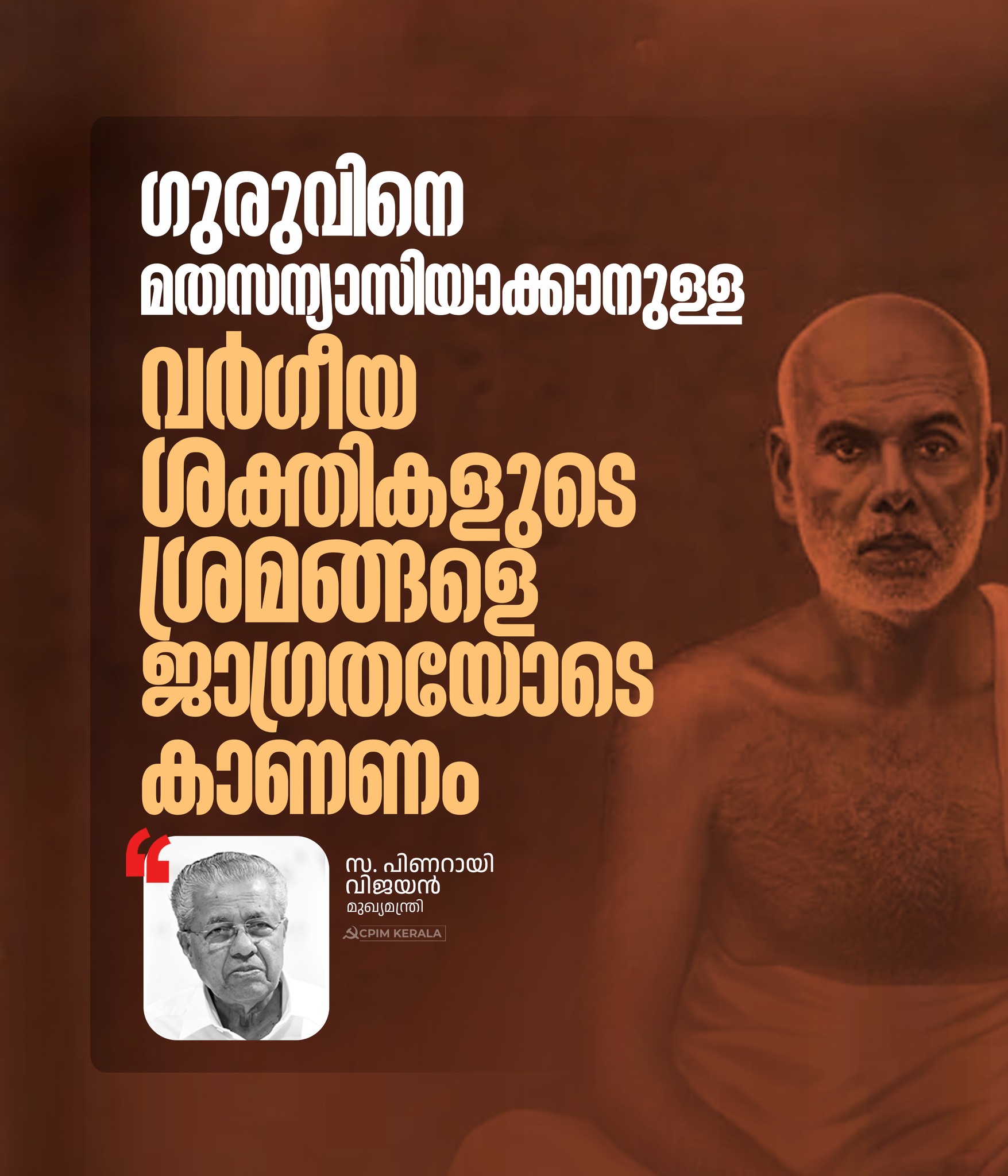 കേവലം ഒരു മതസന്യാസിയാക്കി ശ്രീനാരായണഗുരുവിനെ അവതരിപ്പിക്കാനുള്ള വർഗീയശക്തികളുടെ ശ്രമങ്ങളെ ജാഗ്രതയോടെ കാണണം. മഹാദർശനങ്ങൾ മുന്നോട്ടുവച്ച ഗുരുവിനെ ഹിന്ദുമതനവോത്ഥാനത്തിന്റെ നായകനായി അവതരിപ്പിക്കാൻ വർഗീയശക്തികൾ നടത്തുന്ന ശ്രമത്തിന്റെ ചരിത്രവിരുദ്ധതയെയും മനുഷ്യത്വരാഹിത്യത്തെയും തിരിച്ചറിയാൻ കഴിയണം.