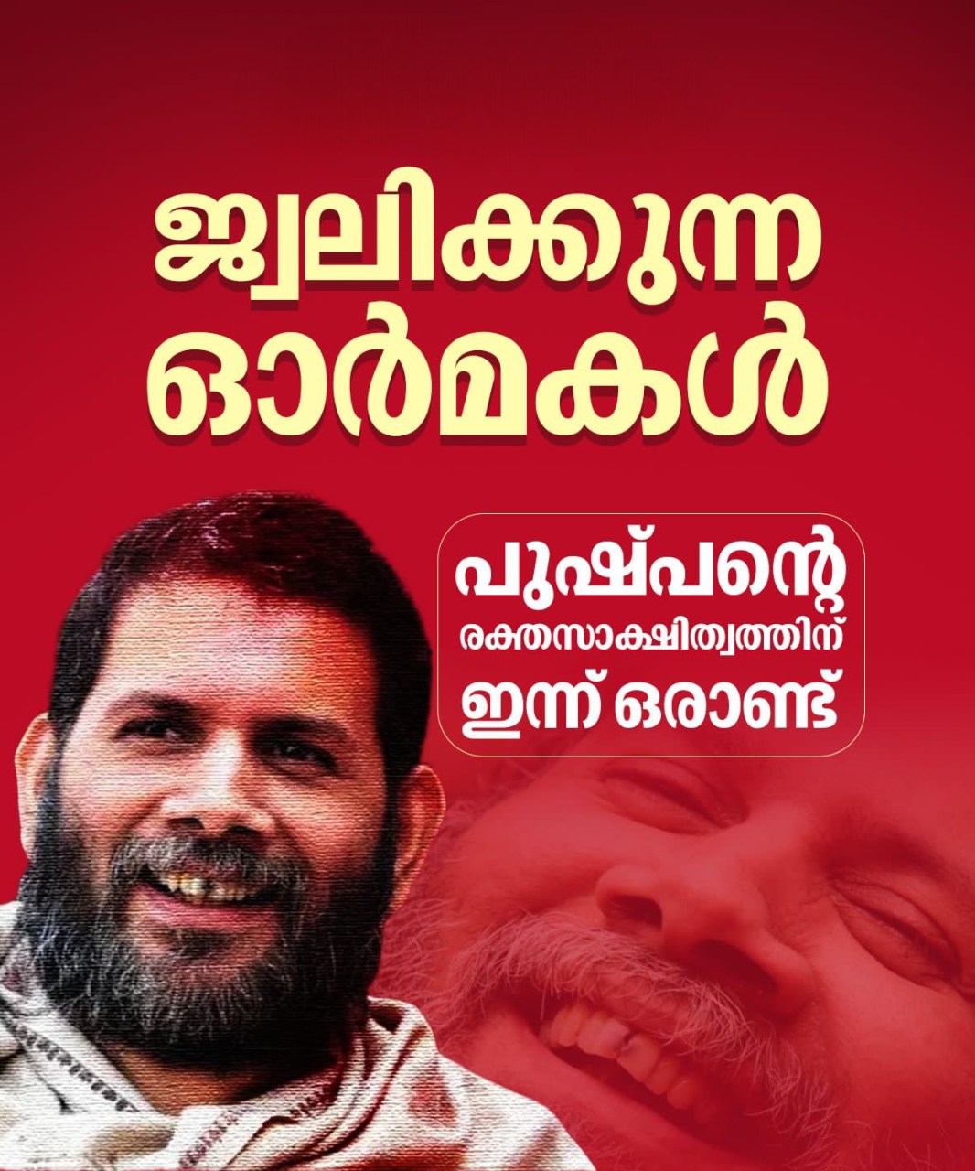 സഖാവ് പുഷ്പന് മരണമില്ല. കൂത്തുപറമ്പ് സമരത്തിലെ ജീവിക്കുന്ന രക്തസാക്ഷിയായ പുഷ്പന്റെ വേർപാടിന് ഇന്നേക്ക് ഒരു വർഷം. മൂന്ന് പതിറ്റാണ്ടു നീണ്ട കിടപ്പുജീവിതത്തിനൊടുവിലാണ് ചൊക്ലി മേനപ്രത്തെ പുതുക്കുടി പുഷ്പന് മരണത്തിന് കീഴടങ്ങിയത്. തളരാത്ത മനോവീര്യത്തോടെ പ്രസ്ഥാനത്തിനോടുള്ള അടങ്ങാത്ത കൂറും പ്രതീക്ഷയും അവസാനം വരെ നെഞ്ചിൽ സൂക്ഷിച്ച പുഷ്പന്റെ അമരസ്മരണ ലക്ഷക്കണക്കിന് സഖാക്കളിലും അനുഭാവികളിലും ജനാധിപത്യ വിശ്വാസികളിലും എക്കാലവും അണയാത്ത ജ്വാലയാണ്.