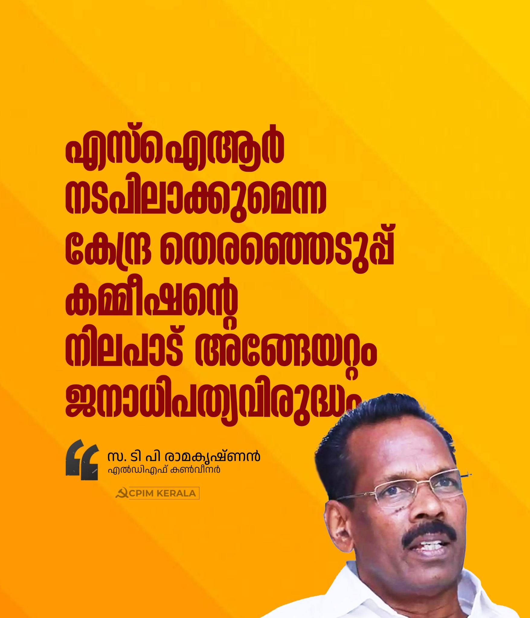 എസ്‌ഐആര്‍ നടപിലാക്കുമെന്ന കേന്ദ്ര തെരഞ്ഞെടുപ്പ്‌ കമ്മീഷന്റെ നിലപാട്‌ അങ്ങേയറ്റം ജനാധിപത്യവിരുദ്ധമാണ്. രാജ്യത്ത്‌ ജനങ്ങള്‍ക്ക്‌ വോട്ടവകാശം ഉറപ്പുവരുത്തുന്നതിന്‌ ഉത്തരവാദിത്വമുള്ള ഭരണഘടനാസ്ഥാപനമായ തെരഞ്ഞെടുപ്പ്‌ കമ്മീഷന്‍ അതിന്റെ വിശ്വാസ്യത കളയുന്ന തരത്തിലുള്ള പ്രവര്‍ത്തനങ്ങളാണ്‌ കഴിഞ്ഞ കുറച്ച്‌ കാലമയി നടപ്പിലാക്കികൊണ്ടിരിക്കുന്നത്‌. ലക്ഷക്കണക്കിന്‌ വോട്ടര്‍മാരുടെ വോട്ടവകാശം ഇല്ലാതാക്കുന്ന നടപടിയാണ്‌ തുടര്‍ച്ചയായി കമ്മീഷന്‍ സ്വീകരിച്ചുകൊണ്ടിരിക്കുന്നത്‌. സംഘപരിവാറിന്റെ രാഷ്ട്രീയ താല്‍പര്യം സംരക്ഷിക്കുന്നവിധമുള്ള പ്രവര്‍ത്തനമാണ്‌ ഇപ്പോള്‍ നടത്തികൊണ്ടിരിക്കുന്നത്‌.