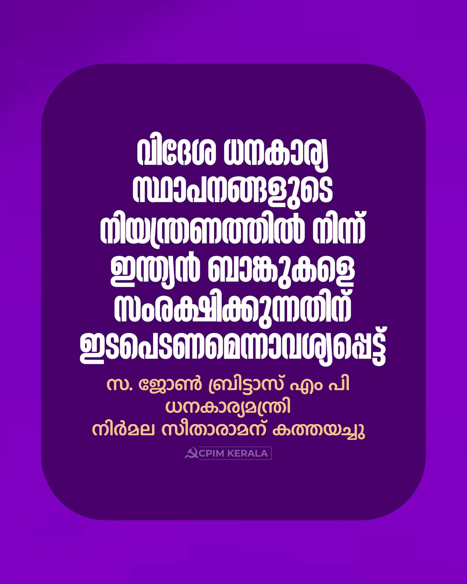 വിദേശ ധനകാര്യ സ്ഥാപനങ്ങളുടെ നിയന്ത്രണത്തിൽ നിന്ന് ഇന്ത്യൻ ബാങ്കുകളെ സംരക്ഷിക്കുന്നതിന് ഇടപെടണമെന്നാവശ്യപ്പെട്ട് സ. ജോൺ ബ്രിട്ടാസ് എം പി ധനകാര്യമന്ത്രി നിർമല സീതാരാമന് കത്തയച്ചു. ബാങ്കിംഗ് മേഖലയിലെ എഫ്ഡിഐ അംഗീകാര ചട്ടക്കൂടിന്റെ അവലോകനം നടത്തണമെന്നും കാത്തലിക്ക് സിറിയന് ബാങ്ക് ജീവനക്കാർക്ക് സേവനവ്യവസ്ഥകളുടെ സംരക്ഷണത്തോടൊപ്പം നിയമാനുസൃതമായ ബിപിഎസ്-ലിങ്ക്ഡ് ശമ്പള പരിഷ്കരണങ്ങൾ ലഭിക്കുന്നുണ്ടെന്ന് ഉറപ്പാക്കണമെന്നും ബ്രിട്ടാസ് ആവശ്യപ്പെട്ടു.