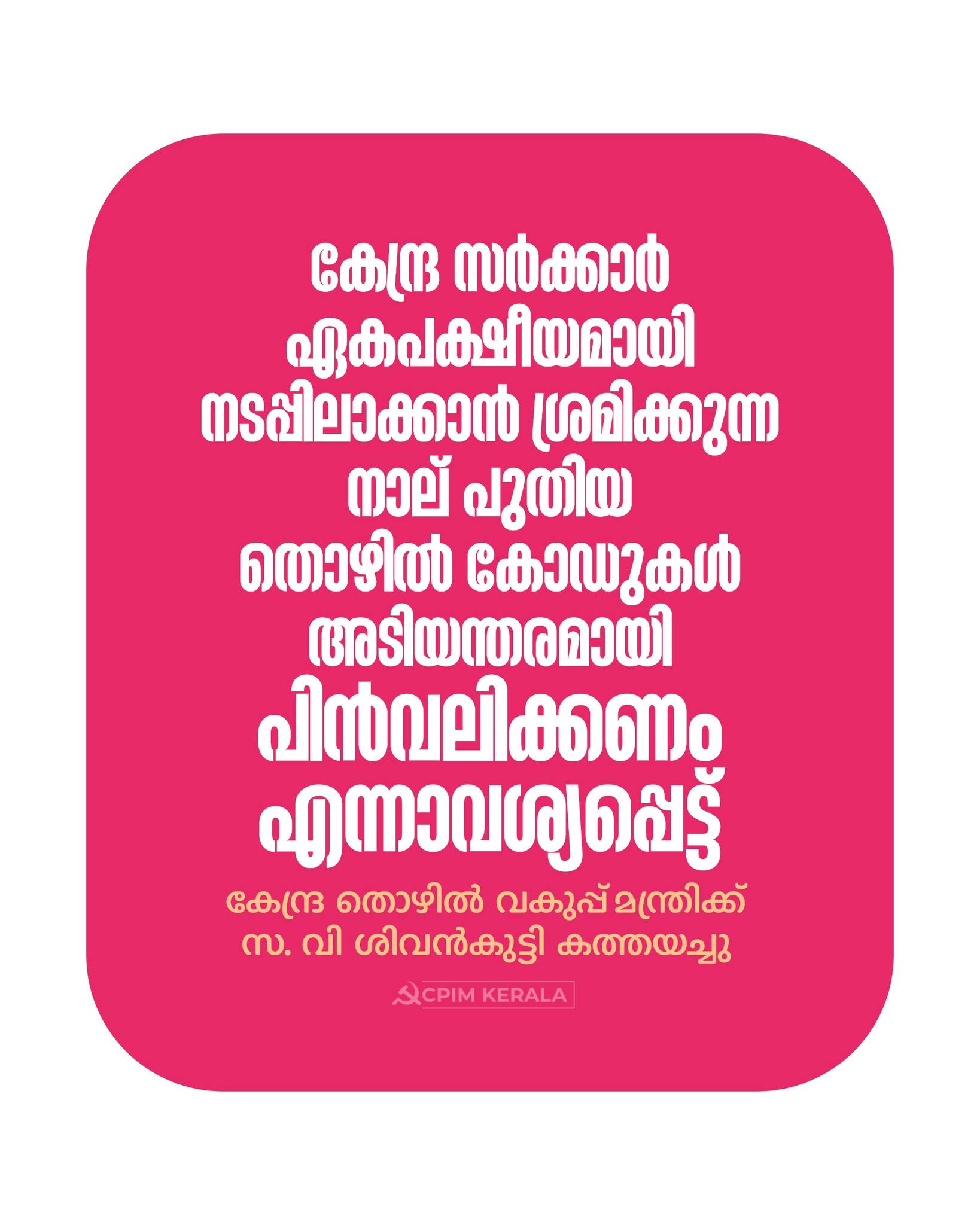 കേന്ദ്ര സർക്കാർ ഏകപക്ഷീയമായി നടപ്പിലാക്കാൻ ശ്രമിക്കുന്ന നാല് പുതിയ തൊഴിൽ കോഡുകൾ അടിയന്തരമായി പിൻവലിക്കണം എന്നാവശ്യപ്പെട്ട് കേന്ദ്ര തൊഴിൽ വകുപ്പ് മന്ത്രി ഡോ. മൻസുഖ് മാണ്ഡവ്യയ്ക്ക് കത്തയച്ചു. നിലവിലുള്ള 29 തൊഴിൽ നിയമങ്ങളെ ലയിപ്പിച്ച് കേന്ദ്രം കൊണ്ടുവന്ന പുതിയ വിജ്ഞാപനം തൊഴിലാളികളുടെ മൗലികാവകാശങ്ങളെ ഹനിക്കുന്നതാണ്. തൊഴിലാളികളുടെ സുരക്ഷയും അവകാശങ്ങളും ബലികഴിച്ചുകൊണ്ടുള്ള ഒരു പരിഷ്കാരവും അംഗീകരിക്കാനാവില്ല.