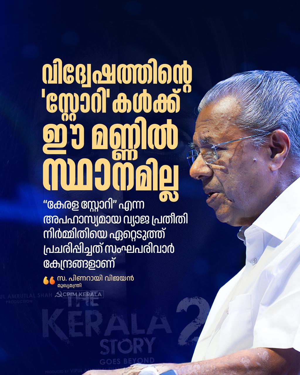 കേരളത്തിനെതിരെ വിദ്വേഷം വിതയ്ക്കാനും നമ്മുടെ മതനിരപേക്ഷ പാരമ്പര്യത്തെ അവഹേളിക്കാനും ലക്ഷ്യമിട്ട് നിർമ്മിക്കപ്പെട്ട “ദി കേരള സ്റ്റോറി” എന്ന ചിത്രത്തിന്റെ രണ്ടാം ഭാഗം പുറത്തിറങ്ങുന്നു എന്ന വാർത്ത ഗൗരവത്തോടെ കാണേണ്ടതാണ്. നട്ടാൽ കുരുക്കാത്ത നുണകളും വിദ്വേഷവും കേരളവിരുദ്ധ പ്രചാരണവും കുത്തിനിറച്ച ഒന്നാം ഭാഗം വർഗീയ ലക്ഷ്യത്തോടെ നിർമ്മിച്ചതാണെന്ന് ഈ നാട് തിരിച്ചറിഞ്ഞതാണ്. കലാസൃഷ്ടിയുടെ മേലങ്കി അണിഞ്ഞ് പുറത്തിറക്കിയ ആ വികൃത സൃഷ്ടിയെ ‘ദ റിയൽ കേരള സ്റ്റോറി' വിളിച്ചുപറഞ്ഞുകൊണ്ട് തള്ളിക്കളഞ്ഞതുമാണ്. സാഹോദര്യവും മതേതരത്വവും ഉയർത്തിപ്പിടിക്കുന്ന കേരളത്തിന്റെ മാതൃകയെ ഭയപ്പെടുന്നവരാണ് തുടർച്ചയായ വിദ്വേഷ പ്രചാരണങ്ങളുടെ അണിയറക്കാർ.