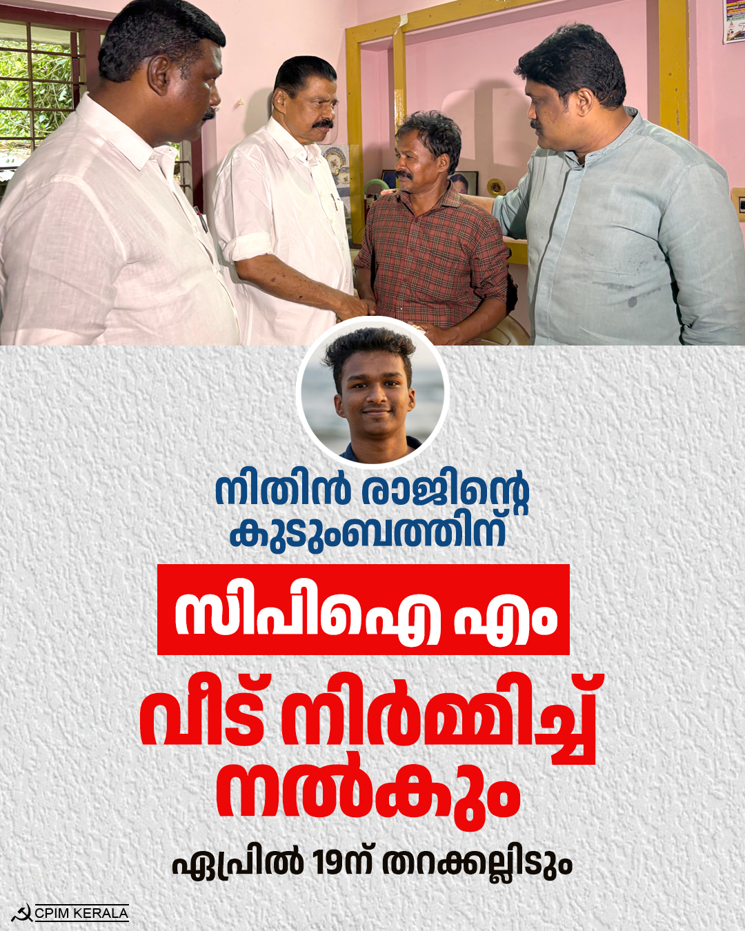 നിതിന്റെ കുടുംബാംഗങ്ങളെ പാർടി സംസ്ഥാന സെക്രട്ടറി സ. എം വി ഗോവിന്ദൻ മാസ്റ്റർ വീട്ടിലെത്തി സന്ദർശിച്ചിരുന്നു. ആ കുടുംബത്തിൻ്റെ ദുഃഖം പറഞ്ഞറിയിക്കാനാവില്ല. നിതിന്റെ കുടുംബത്തിന് സർക്കാരിന്റെ എല്ലാവിധ പിന്തുണയുമുണ്ടാകും. വീട് നിർമിച്ച് നൽകുമെന്നത് വെറും പ്രഖ്യാപനം മാത്രമല്ല, മറിച്ച് ഉടൻ തന്നെ പ്രവർത്തനം ആരംഭിക്കുകയാണ്. ഏപ്രിൽ 19-ാം തീയതി വൈകീട്ട് അഞ്ചു മണിക്ക് സിപിഐ എം സംസ്ഥാന സെക്രട്ടറി സ. എം വി ഗോവിന്ദൻ മാസ്റ്റർ വീടിന് തറക്കല്ലിടും. അടുത്ത ദിവസം തന്നെ വീടു നിർമാണം ആരംഭിക്കും.