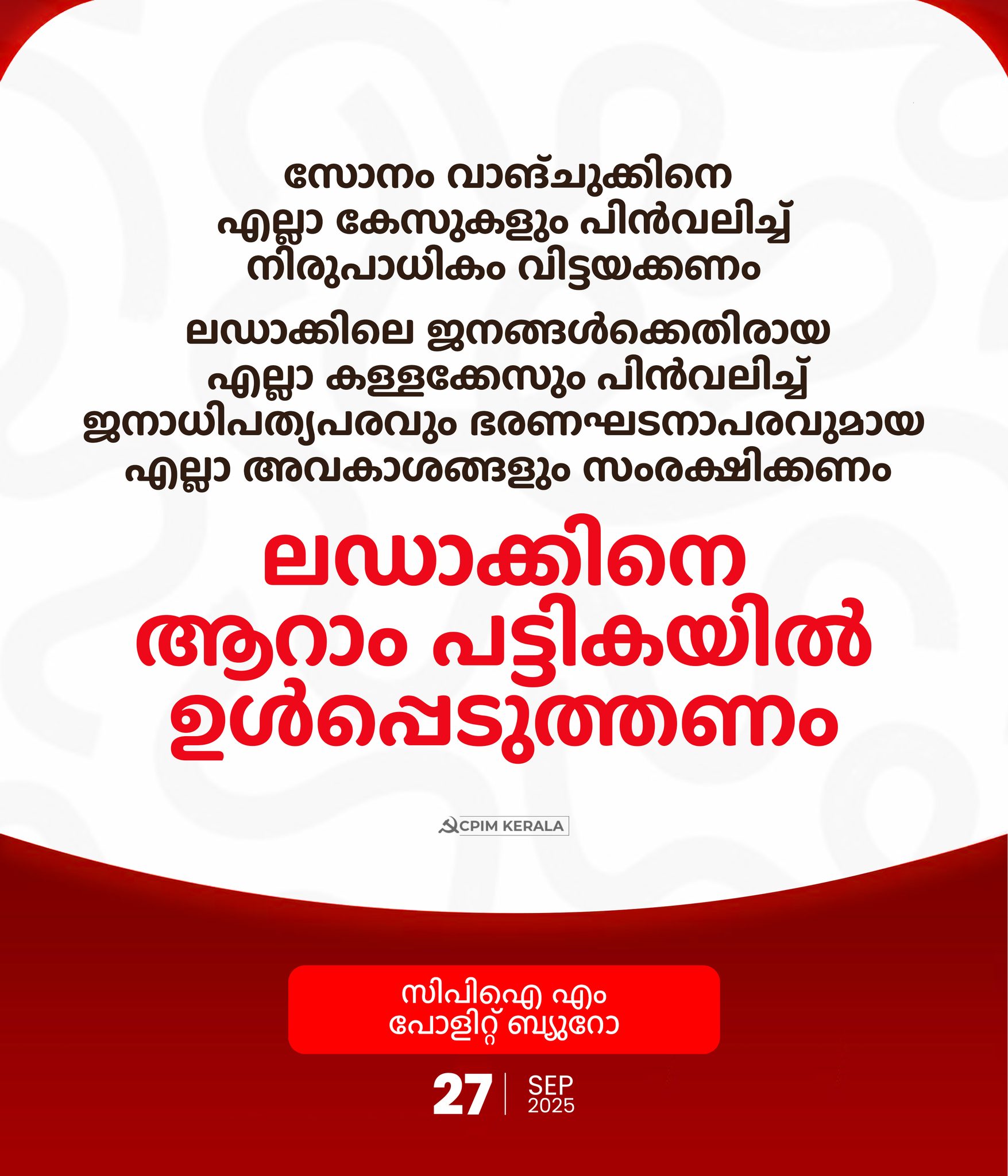 ലഡാക്കിന് സംസ്ഥാന പദവി നൽകണമെന്നും ഭരണഘടനയുടെ ആറാം പട്ടികയിൽ ഉൾപ്പെടുത്തണമെന്നും ആവശ്യപ്പെട്ട് നടക്കുന്ന പ്രക്ഷോഭത്തിന്റെ മുന്നണിപ്പോരാളി സോനം വാങ്ചുക്കിനെ അറസ്റ്റുചെയ്തതിൽ പ്രതിഷേധിക്കുന്നു. വാങ്ചുക്കിനെ ദേശസുരക്ഷാ നിയമപ്രകാരം അറസ്റ്റുചെയ്തത് മോദിസർക്കാരിന്റെ സ്വേച്ഛാധിപത്യ സ്വഭാവവും ലഡാക്ക് ജനതയുടെ അഭിലാഷങ്ങളോട് അവർ പുലർത്തുന്ന അവജ്ഞയും വെളിപ്പെടുത്തുന്നു.