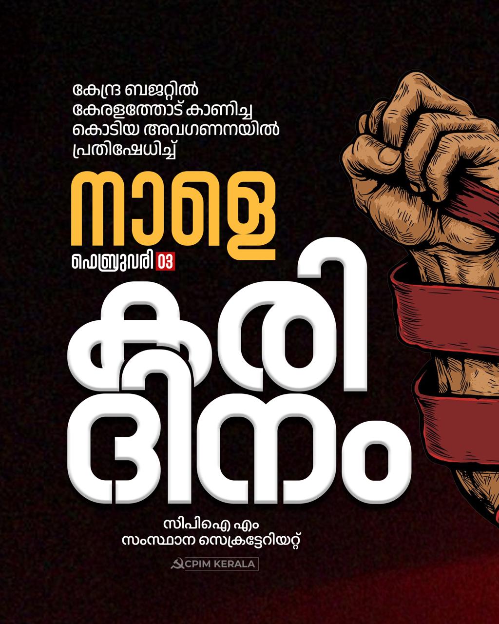 കേന്ദ്ര ബജറ്റില് കേരളത്തോട് കാണിച്ച കൊടിയ അവഗണനയില് പ്രതിഷേധിച്ച് ഫെബ്രുവരി 3-ാം തീയ്യതി കരിദിനമായി ആചരിക്കാന് ആഹ്വാനം ചെയ്യുന്നു. ഇന്ത്യയുടെ ഭൂപടത്തില് കേരളം നിലനില്ക്കുന്നില്ല എന്ന രീതിയിലുള്ള ബജറ്റാണ് അവതരിപ്പിച്ചിട്ടുള്ളത്. ബജറ്റിന് മുമ്പ് കേന്ദ്ര ധനമന്ത്രിയുമായി നടത്തിയ ചര്ച്ചയില് കേരളം 29 ആവശ്യങ്ങള് ഉന്നയിച്ചിരുന്നു. ഇത് ഒന്നുപോലും പരിഗണിച്ചില്ല. സംസ്ഥാനം ദീര്ഘകാലമായി ആവശ്യപ്പെടുന്ന ഒരു പദ്ധതിയും കേരളത്തിന് ലഭിച്ചില്ല. കേരളത്തിന്റെ സ്വപ്നമായ എയിംസ് ഈ ബജറ്റിലും പ്രഖ്യാപിച്ചില്ല. റെയില്വെ വികസനത്തിനായുള്ള 7 അതിവേഗ ഇടനാഴികളിലും കേരളമില്ല. വിഴിഞ്ഞം തുറമുഖത്തിന്റെ വികസനത്തിനുള്ള. പ്രത്യേക പാക്കേജും അംഗീകരിക്കപ്പെട്ടില്ല. ആയുര്വ്വേദത്തിന്റെ ഈറ്റില്ലമായ കേരളത്തിന് ആയുര്വ്വേദ എയിംസ് ഇല്ല. ഉള്നാടന് ജല ഗതാഗത പദ്ധതിയിലും കേരളമില്ല.