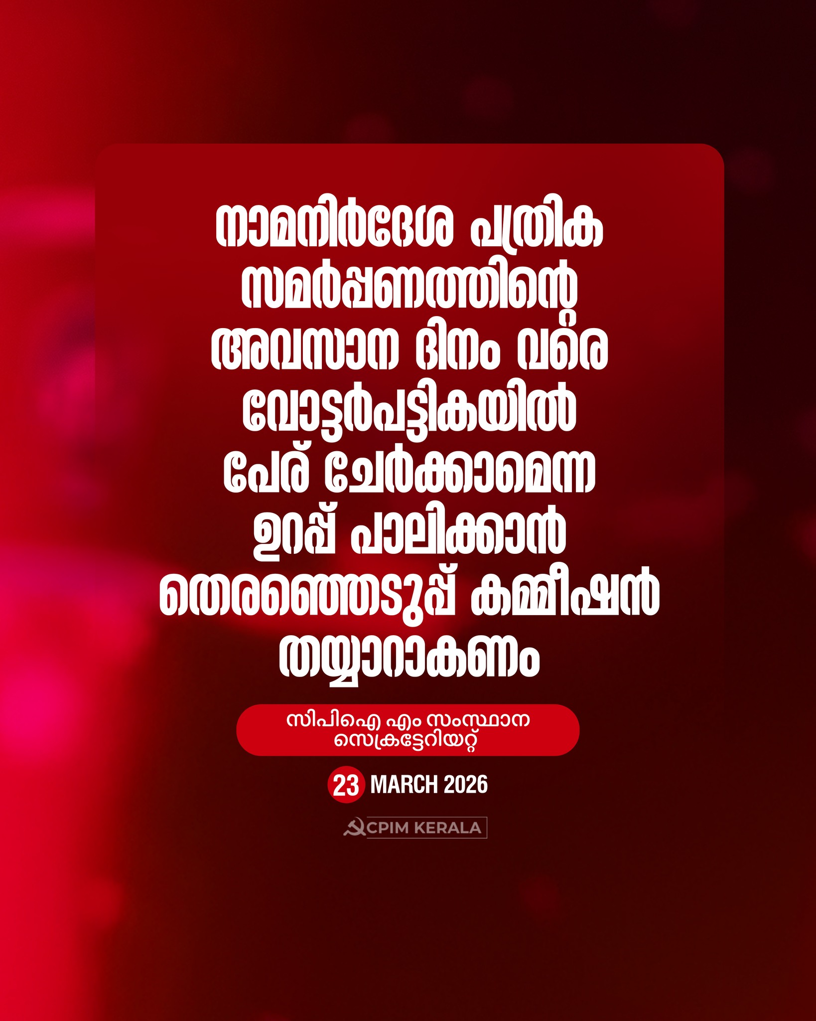 നാമനിര്‍ദേശ പത്രികാ സമര്‍പ്പണത്തിന്റെ അവസാന ദിവസം വരെ അപേക്ഷ നല്‍കി വോട്ടര്‍പട്ടികയില്‍ പേര്‌ ചേര്‍ക്കാമെന്ന ഉറപ്പ്‌ പാലിക്കാന്‍ തെരഞ്ഞെടുപ്പ്‌ കമ്മീഷന്‍ തയ്യാറാകണം. മാര്‍ച്ച്‌ 15-ന്‌ ശേഷമുള്ള അപേക്ഷകള്‍ പരിഗണിക്കില്ലെന്ന്‌ വ്യക്തമാക്കിയുള്ള തെരഞ്ഞെടുപ്പ്‌ കമ്മീഷന്റെ വാര്‍ത്താക്കുറിപ്പ്‌, വോട്ടവകാശമെന്ന ഭരണഘടനാപരമായ അവകാശത്തിന്‌ മേലുള്ള കടന്നുകയറ്റമാണ്‌. ലക്ഷക്കണക്കിന്‌ പേര്‍ക്ക്‌ വോട്ടവകാശം നിഷേധിക്കാന്‍ തെരഞ്ഞെടുപ്പ്‌ കമ്മീഷന്റെ ഈ തീരുമാനം കാരണമാകും.