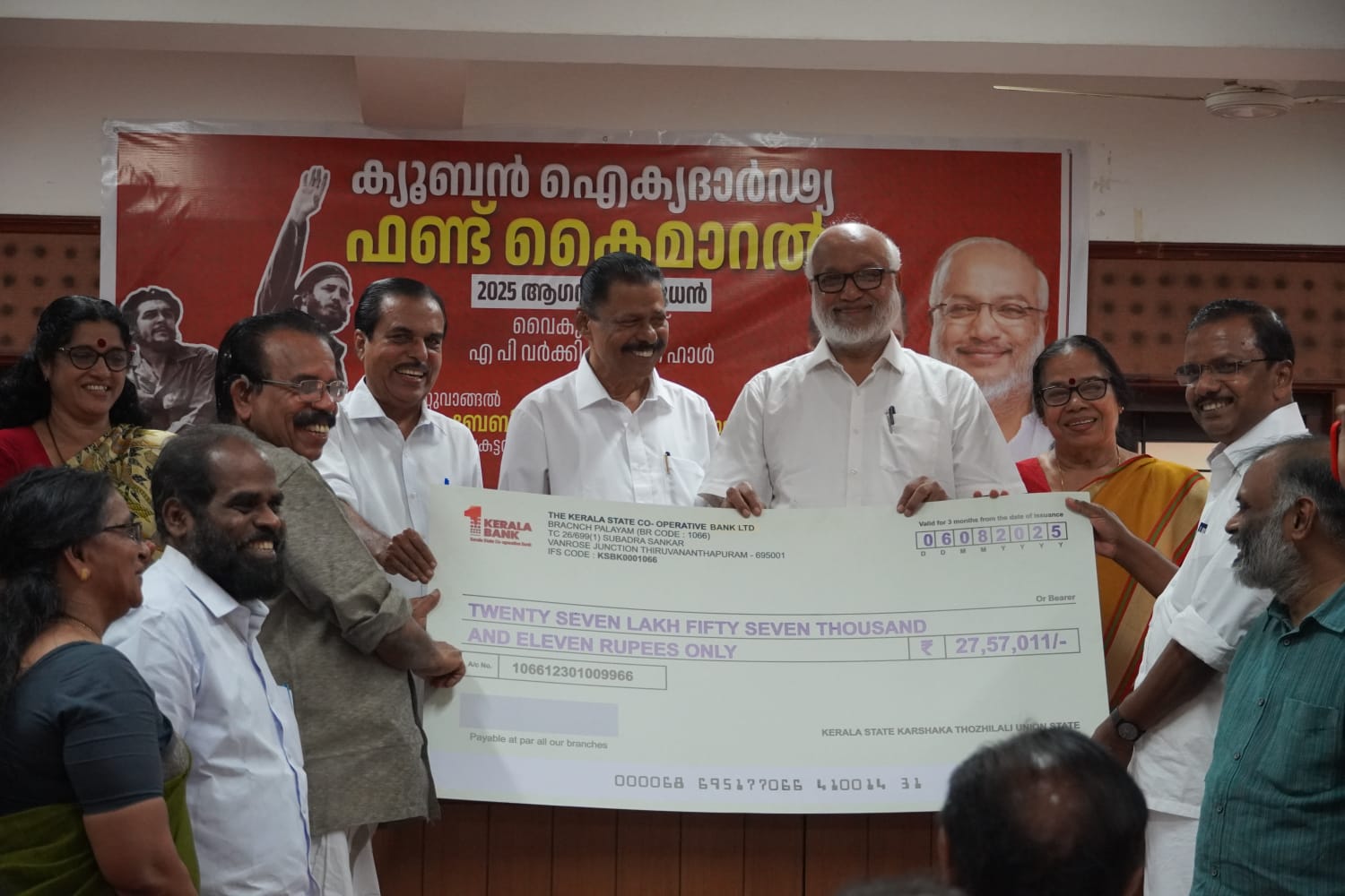 അമേരിക്കൻ സാമ്രാജ്യത്വത്തിന്റെ സാമ്പത്തിക ഉപരോധം നേരിടുന്ന ക്യൂബയെ സഹായിക്കുന്നതിന് വേണ്ടിയുള്ള ക്യൂബൻ സോളിഡാരിറ്റി ഫണ്ട് വർഗ്ഗ ബഹുജന സംഘടനകളിൽ നിന്നും സിപിഐ എം ജനറൽ സെക്രട്ടറി സ. എം എ ബേബി ഏറ്റുവാങ്ങി. വിവിധ വർഗ്ഗ ബഹുജന സംഘടനകൾ സമാഹരിച്ച 01 കോടി 29 ലക്ഷം രൂപയാണ് കൈമാറിയത്.