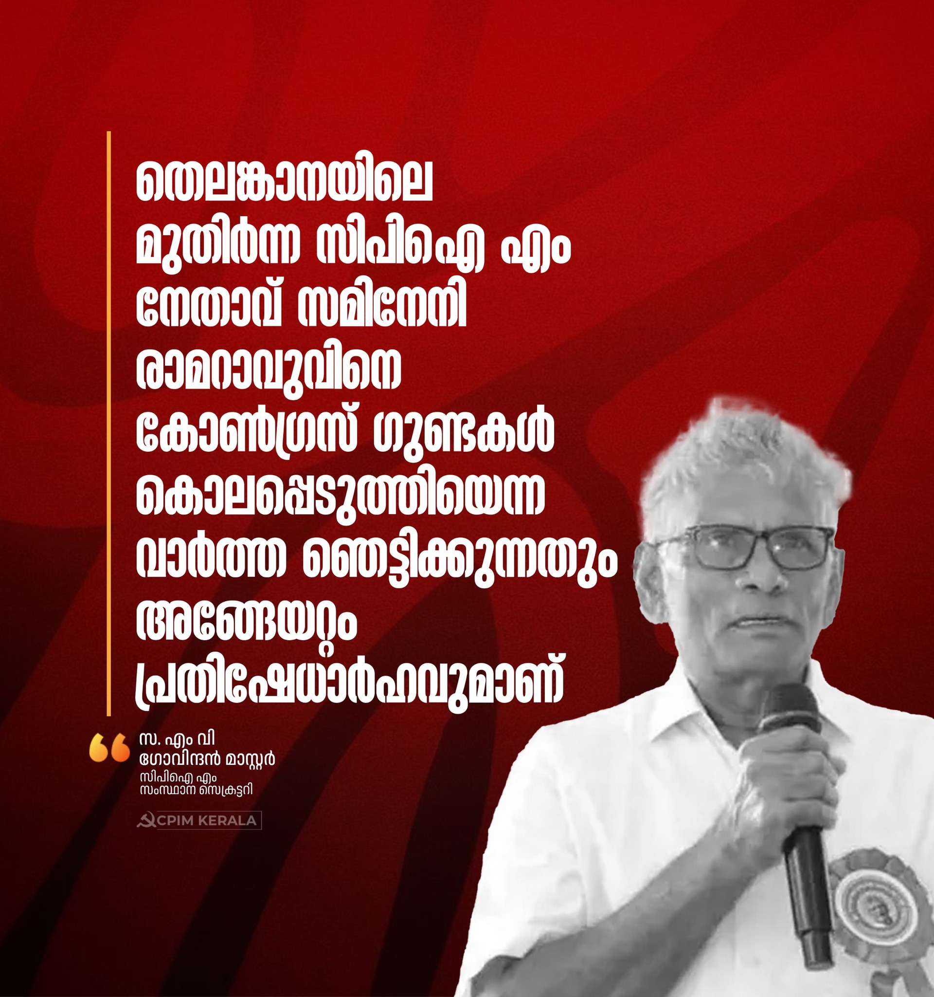 തെലങ്കാനയിലെ മുതിർന്ന സിപിഐ എം നേതാവ് സമിനേനി രാമറാവുവിനെ കോൺഗ്രസ് ഗുണ്ടകൾ കൊലപ്പെടുത്തിയെന്ന വാർത്ത ഞെട്ടിക്കുന്നതും അങ്ങേയറ്റം പ്രതിഷേധാർഹവുമാണ്. പ്രാദേശിക തെരഞ്ഞെടുപ്പിൽ പരാജയപ്പെടുമെന്ന ഭയത്തിലാണ് കോൺഗ്രസ് ഗുണ്ടാസംഘം കൊലപാതകം ആസൂത്രണം ചെയ്തത്. മൂന്ന് പതിറ്റാണ്ടോളം പട്ടർലപ്പാട്ട് ഗ്രാമത്തിലെ സർപഞ്ചായിരുന്ന അദ്ദേഹം ജനങ്ങൾക്കിടയിൽ വലിയ സ്വാധീനമുള്ള നേതാവായിരുന്നു. അതിൽ വിറളിപൂണ്ട കോൺഗ്രസ് അദ്ദേഹത്തെ കഴുത്തറുത്ത് കൊലപ്പെടുത്തുകയായിരുന്നു. ജനകീയരായ നേതാക്കളെയും പ്രവർത്തകരെയും കൊന്നുതള്ളി ജനാധിപത്യം അട്ടിമറിക്കാമെന്ന വികലചിന്തയാണ് ഇത്തരം ഹീനകൃത്യങ്ങൾക്ക് പിന്നിൽ. കൊലക്കത്തി രാഷ്ട്രീയത്തിൽ നിന്നും പിന്മാറാൻ കോൺഗ്രസ് തയ്യാറാകണം.