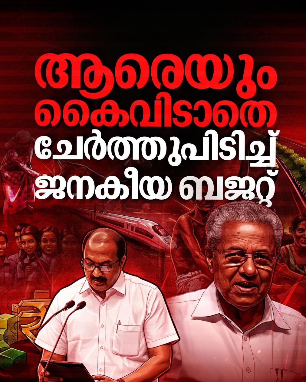നാടിൻ്റെ മുഖച്ഛായ മാറുന്ന വികസന കുതിപ്പും ഓരോ മനുഷ്യനെയും കരുതലോടെ കാക്കുന്ന ക്ഷേമപ്രവർത്തനങ്ങളും സമന്വയിക്കുന്ന ബജറ്റാണ് ധനമന്ത്രി നിയമസഭയിൽ അവതരിപ്പിച്ചത്. ആധുനിക സമൂഹ സൃഷ്ടിക്കായുള്ള ജനകീയ ബജറ്റ് കേന്ദ്രം സാമ്പത്തികമായി ശ്വാസം മുട്ടിക്കുമ്പോഴും തനത് ബദൽ മാർഗ്ഗങ്ങളിലൂടെ കുതിക്കാനാവുമെന്ന ഒരു നാടിൻ്റെ ധീരമായ പ്രഖ്യാപനമാണ്.