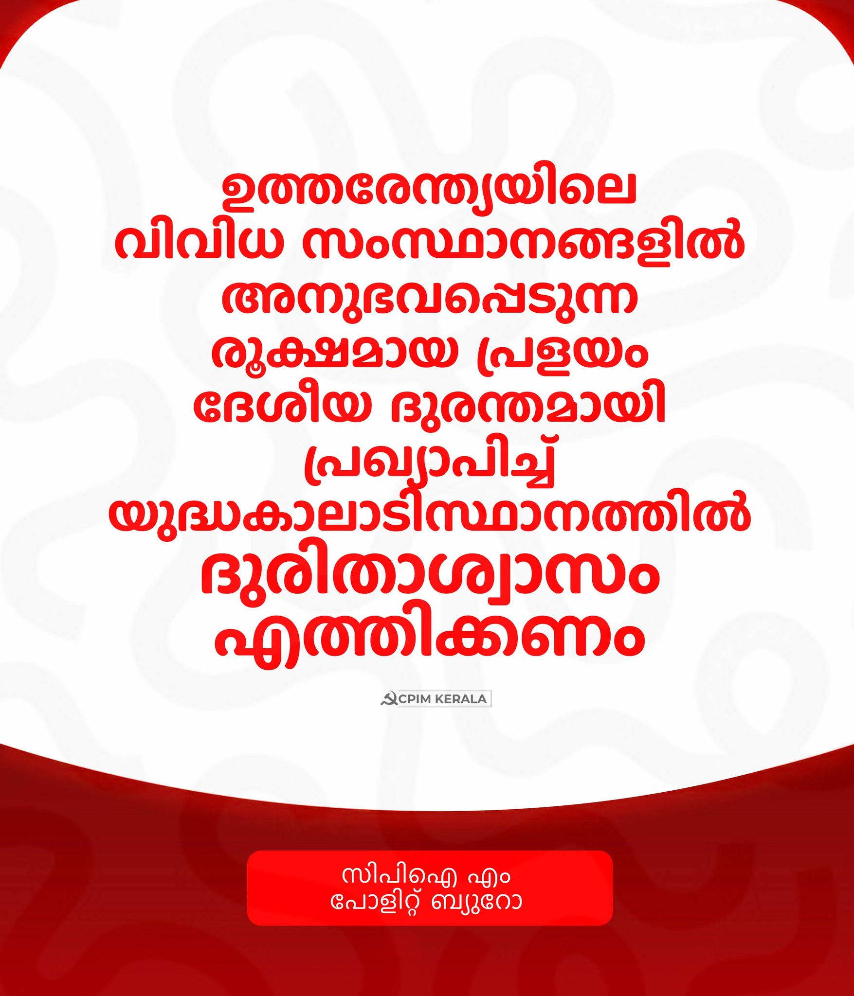 ബിജെപി നയിക്കുന്ന കേന്ദ്രസർക്കാർ നിഷ്‌ക്രിയത്വം പാലിക്കുകയാണ്‌. ദുരിതാശ്വാസം എത്തിക്കാൻ എല്ലായിടത്തും സിപിഐ എം പ്രവർത്തകർ സജീവമാണ്‌. അതത്‌ സംസ്ഥാനങ്ങളിൽ ദുരിതാശ്വാസ പ്രവർത്തനങ്ങളിൽ പങ്കാളികളാകാനും ആവശ്യമായ ഫണ്ട്‌ ശേഖരിക്കാനും പാർടി പ്രവർത്തകരോട്‌ ആഹ്വാനം ചെയ്യുന്നു.