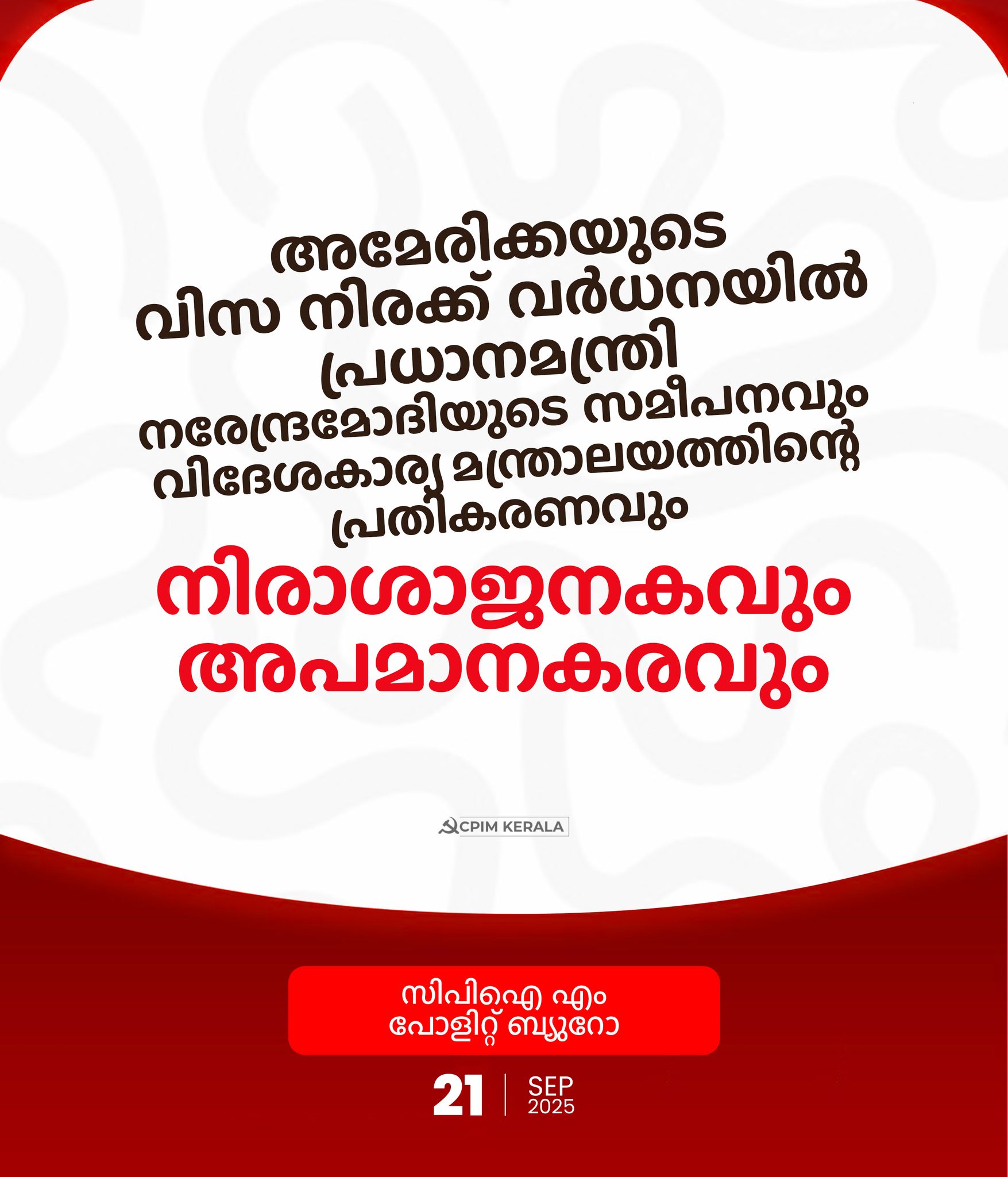 അമേരിക്കയുടെ വിസ നിരക്ക് വർധനയിൽ പ്രധാനമന്ത്രി നരേന്ദ്രമോദിയുടെ സമീപനവും വിദേശകാര്യ മന്ത്രാലയത്തിന്റെ പ്രതികരണവും നിരാശാജനകവും അപമാനകരവുമാണ്. മറ്റ് രാജ്യങ്ങളുടെ ചെലവിൽ സ്വന്തം വ്യാപാര താൽപ്പര്യങ്ങൾ മുന്നോട്ട് കൊണ്ടുപോകുന്നതിനായി യുഎസ് നിർബന്ധിത തന്ത്രങ്ങൾ ഉപയോഗിക്കുകയാണ്. ഇന്ത്യ നടത്തുന്ന ഇറാന്റെ ചാബഹാർ തുറമുഖ പദ്ധതിയിൽ 50 ശതമാനം താരിഫും ഉപരോധങ്ങളും ഏർപ്പെടുത്തിയതിന് തൊട്ടുപിന്നാലെയാണ് ഈ നീക്കം. ഉഭയകക്ഷി വ്യാപാര ചർച്ചകൾ പുനരാരംഭിച്ചതോടെ ഇന്ത്യയെ സമ്മർദ്ദത്തിലാക്കാനാണ് ഈ നടപടികൾ. അന്യായമായ യുഎസ് താരിഫ് സംബന്ധിച്ച ആവശ്യങ്ങൾക്ക് വഴങ്ങാൻ ഇന്ത്യയെ നിർബന്ധിക്കുക എന്നതാണ് ട്രംപ് ഭരണകൂടത്തിന്റെ ലക്ഷ്യം.