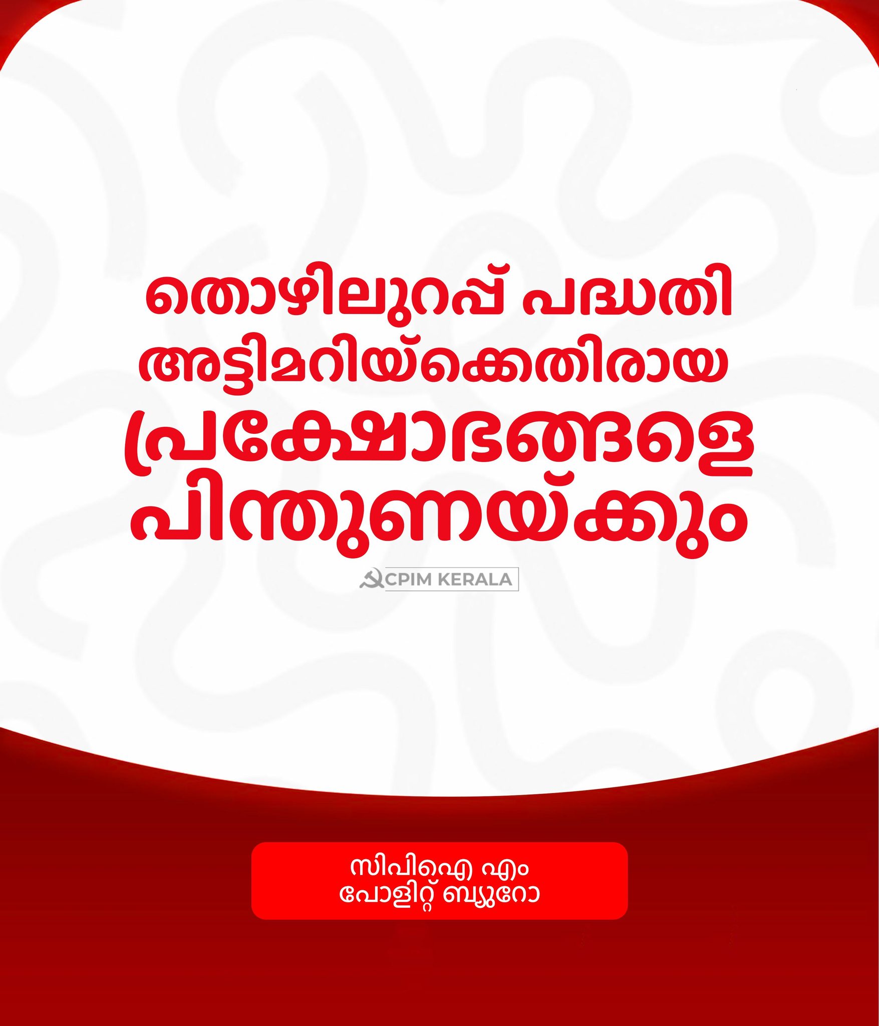 ഗ്രാമീണ തൊഴിലുറപ്പ് പദ്ധതിയെ അട്ടിമറിച്ച കേന്ദ്ര നടപടികൾക്കെതിരായി വിവിധ സംഘടനകൾ പ്രഖ്യാപിച്ചിട്ടുള്ള പ്രക്ഷോഭസമരങ്ങളെ പിന്തുണയ്ക്കും. തൊഴിലുറപ്പിന് പകരമായി തീർത്തും ദുർബലമായ മറ്റൊരു പദ്ധതി കേന്ദ്ര ബിജെപി സർക്കാർ അടിച്ചേൽപ്പിക്കുകയാണ്. തൊഴിലിന്റെ ആവശ്യകതയെയും അവകാശത്തെയും അടിസ്ഥാനപ്പെടുത്തിയുള്ള തൊഴിലുറപ്പ് പദ്ധതിയുടെ അടിസ്ഥാനഘടനയെ തന്നെ അട്ടിമറിച്ചിരിക്കുകയാണ്.