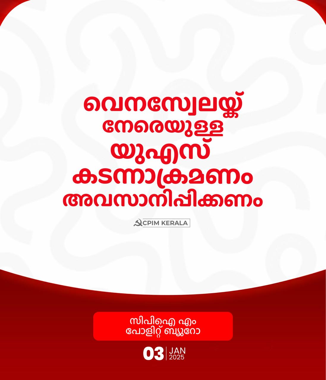 വെനസ്വേലയിൽ അമേരിക്ക നടത്തിയത് നഗ്നമായ സാമ്രാജ്യത്വ ആക്രമണമാണ്. വിവിധ തന്ത്രപ്രധാന കേന്ദ്രങ്ങളിൽ അമേരിക്ക ബോംബാക്രമണം നടത്തി. സ്വന്തം താത്പര്യങ്ങൾ സംരക്ഷിക്കുന്നതിനായി തെക്കൻ അർദ്ധഗോളത്തിൽ ശത്രുത വളർത്താൻ ശ്രമിക്കുന്ന ഒരു 'തെമ്മാടി രാഷ്ട്രമായി' അമേരിക്ക മാറിയിരിക്കുകയാണ്. ഇത് ഭീകരപ്രവർത്തനമാണ്.
