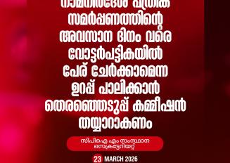 ഏപ്രില് 9-ന് നടക്കുന്ന നിയമസഭാ തെരഞ്ഞെടുപ്പില് എല്.ഡി.എഫ് സ്ഥാനാര്ത്ഥികളെ വമ്പിച്ച ഭൂരിപക്ഷത്തോടെ വിജയിപ്പിക്കുക