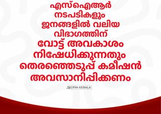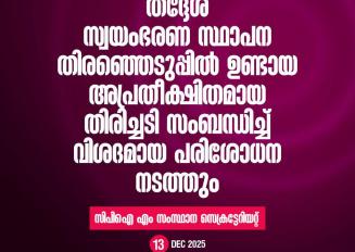 13/12/2025തദ്ദേശ സ്വയംഭരണ സ്ഥാപനങ്ങളിലേക്ക് നടന്ന തെരഞ്ഞെടുപ്പില് ഉണ്ടായ അപ്രതീക്ഷിതമായ തിരിച്ചടി സംബന്ധിച്ച് വിശദമായ പരിശോധന നടത്തും. എല്ലാ ഘട്ടങ്ങളിലും ശരിയായ പരിശോധന നടത്തി ആവശ്യമായ തിരുത്തലുകള് വരുത്തിയാണ് പാര്ടി മുന്നോട്ടുപോയിട്ടുള്ളത്.