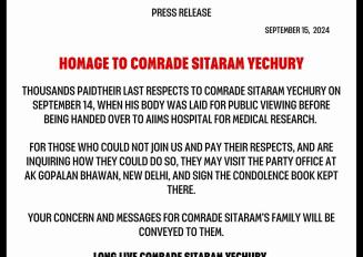 സഖാവ് സീതാറാമിന് അന്ത്യാഭിവാദ്യം അർപ്പിക്കാൻ കഴിയാതെപോയവർക്കും, തുടർന്നും പ്രിയ സഖാവിന് അന്ത്യാഭിവാദ്യം അർപ്പിക്കാൻ ആഗ്രഹിക്കുന്നവർക്കും പാർടി ആസ്ഥാനമായ എകെജി ഭവൻ സന്ദർശിക്കുകയും തങ്ങളുടെ അനുശോചനം രേഖപ്പെടുത്താവുന്നതുമാണ്